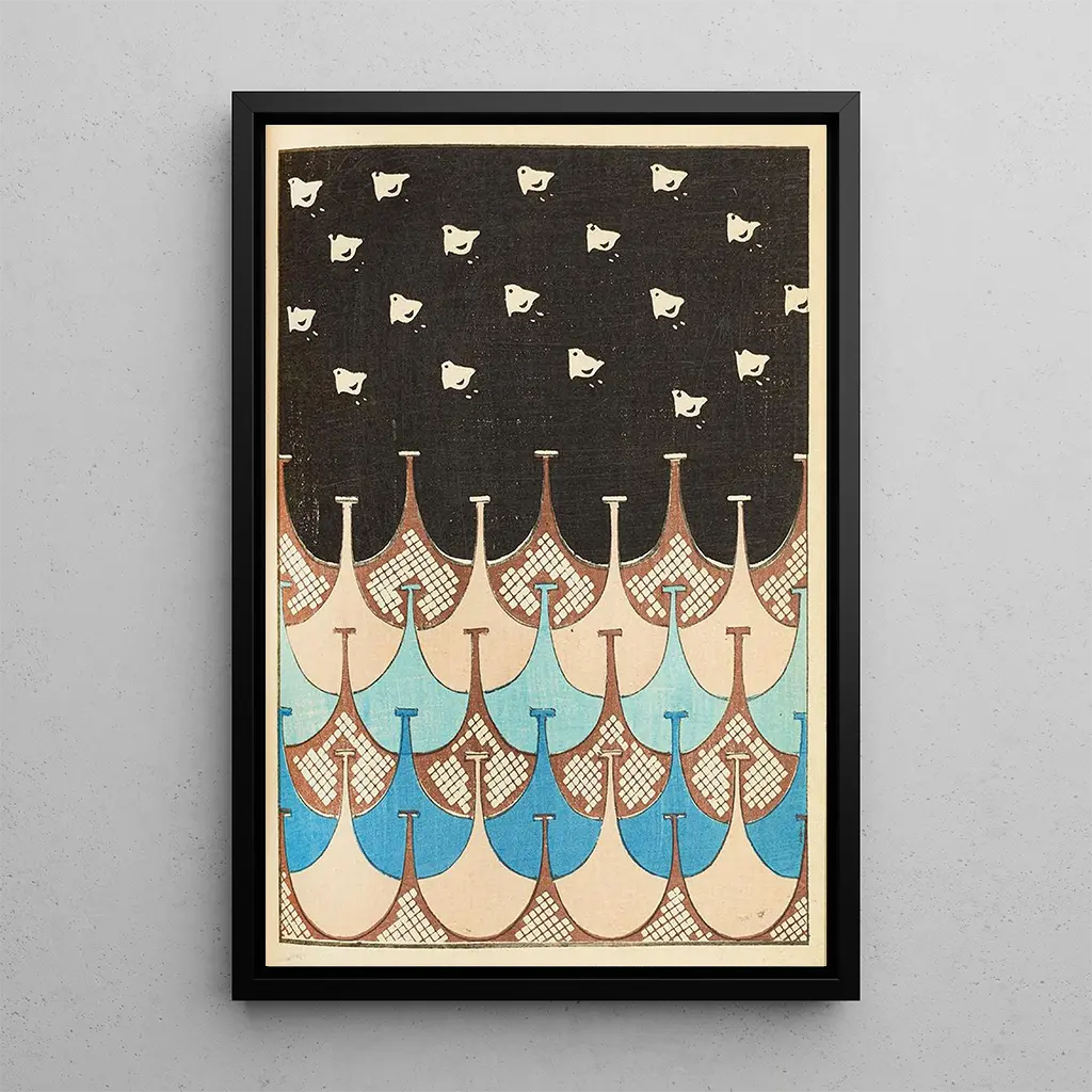 Konsttrycket av Bijutsukai Pl146 är ett fängslande verk som framkallar en mjuk visuell melodi. De livfulla färgerna, som sträcker sig från djupa blå nyanser till glänsande röda, flätas samman med en anmärkningsvärt finstämdhet. Tekniken som konstnären använder, som kombinerar akvarell och bläck, ger denna duk en atmosfär som är både lugnande och dynamisk. Varje element tycks dansa på ytan, inbjudande betraktaren att fördjupa sig i en värld där natur och konst möts. Detta verk är en sann hyllning till skönheten och fångar den mänskliga kreativitetens essens.