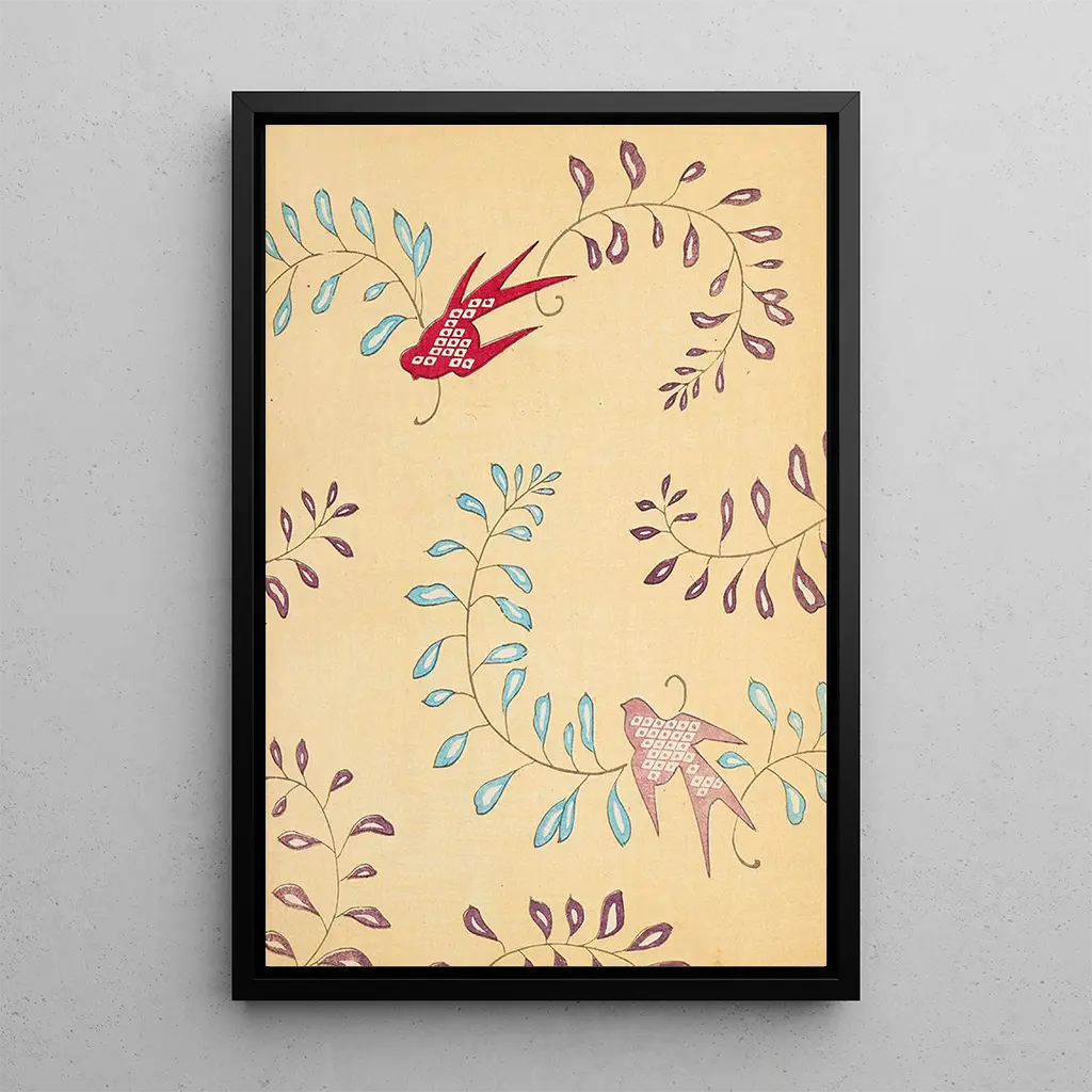 I detta konsttryck av Bijutsukai Pl42 breder Furuya Korins verk ut sig med en anmärkningsvärt finstämdhet. De livfulla färgerna och de blomsterinspirerade mönstren flätas samman för att skapa en lugn och kontemplativ atmosfär. Tekniken med målning på siden, som är typisk för japansk konst, ger denna duk en unik, nästan taktil textur. Varje detalj, från kronblad till blad, tycks vibrera under ljuset och inbjuder betraktaren att fördjupa sig i en värld av frid och skönhet. Verket framkallar en hemlig trädgård där naturen blomstrar i all sin prakt.