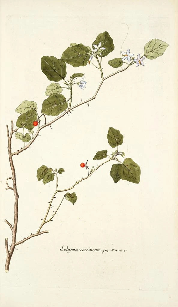 Nikolaus Joseph Freiherr von Jacquin, botanist och konstnär från 1700-talet, lyckades förena sina passioner för vetenskap och konst. Hans djupgående studier av exotiska växter, utförda under resor, ledde till att han skapade verk som är både vetenskapliga dokument och konstnärliga skapelser. Solanum coccineum är ett perfekt exempel på hans tillvägagångssätt, där varje detalj noggrant observeras och återges. Hans arbete har haft en varaktig inverkan på botanik och blomsterkonst, och inspirerat många konstnärer och vetenskapsmän genom tiderna.