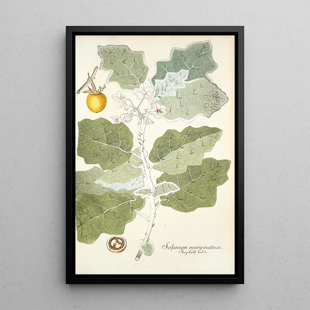 Konsttrycket av Solanum marginatum är ett dekorativt föremål som kommer att försköna vilket som helst utrymme. Oavsett om det är i ett vardagsrum, ett kontor eller ett sovrum, tillför detta konsttryck en touch av natur och lugn. Dess utskriftskvalitet garanterar en enastående trohet mot färger och detaljer i originalverket, vilket möjliggör full uppskattning av växtens skönhet. Genom att integrera detta konsttryck i din inredning tillför du inte bara ett konstverk, utan också ett samtalsämne som kommer att glädja dina gäster.