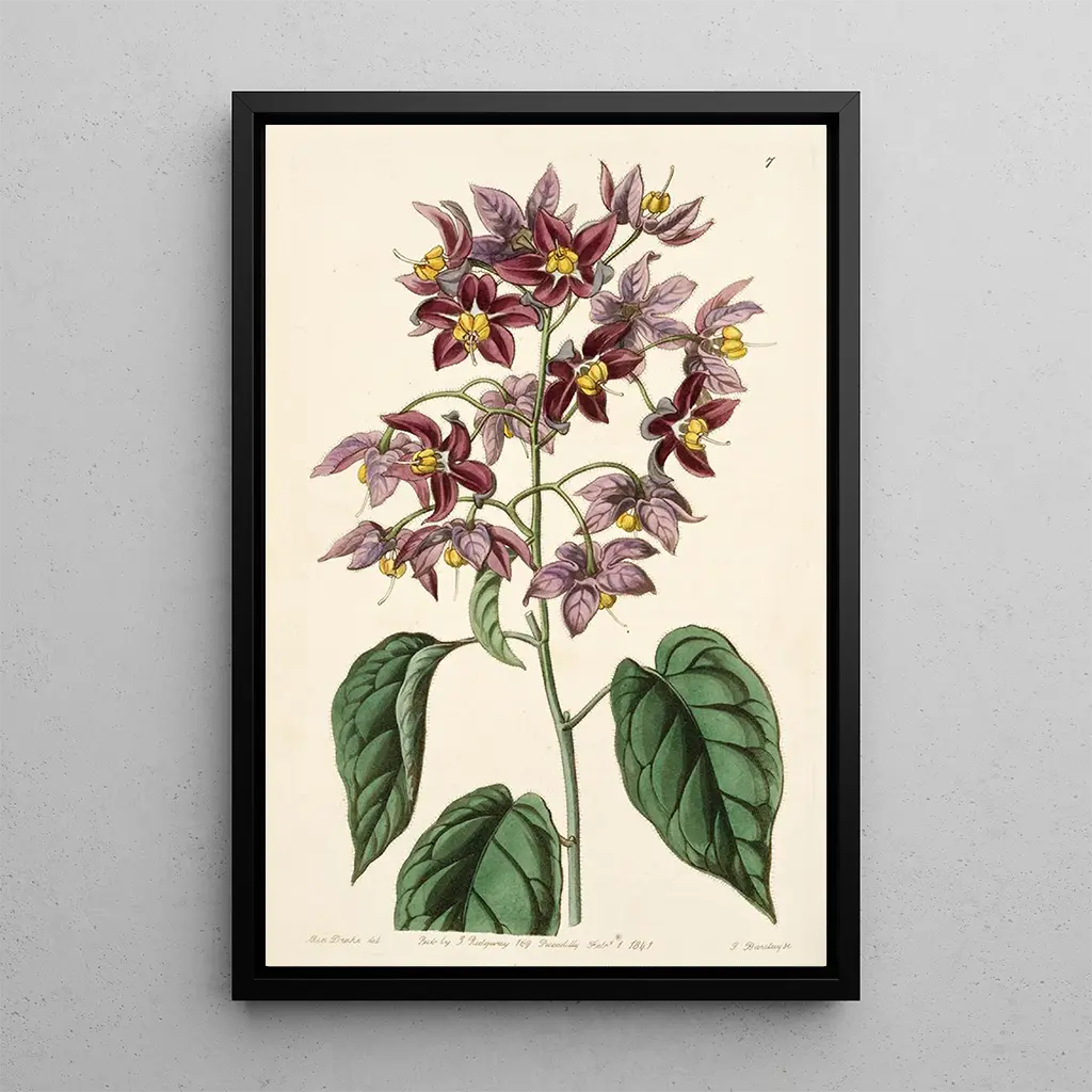 Douce-amère à grandes anthères : en konsttryck som tar dig på en resa till naturens hjärta Den konsttryck av Douce-amère à grandes anthères för oss till en värld där naturen blomstrar med elegans. De skimrande färgerna på blommorna, kombinerade med delikata detaljer, framkallar en känsla av lätthet och friskhet. Akvarelltekniken, som behärskas av Sydenham Edwards, gör det möjligt att återge genomskinligheten hos kronbladen och djupet i skuggorna. Detta verk, både poetiskt och vetenskapligt, inbjuder till noggrann eftertanke av naturens underverk och avslöjar de gömda skönheterna hos växterna. Sydenham Edwards : en konstnär i tjänst för vetenskapen Sydenham Edwards, botanisk illustratör från början av 1800-talet, präglade sin tid med sina verk som förenar konst och vetenskap. Hans konstnärliga utbildning, kombinerad med en passion för botanik, gjorde det möjligt för honom att skapa illustrationer med exceptionell precision. Edwards påverkades av de vetenskapliga framstegen under sin tid, vilket gjorde att han kunde dokumentera växtarternas mångfald med noggrannhet. Hans verk, ofta publicerade i specialiserade böcker, bidrog till utvecklingen av botanisk illustration och gjorde honom till en framstående figur inom detta område. En dekorativ förvärv med många fördelar Konsttrycket av Douce-amère à grandes anthères är ett perfekt val för att försköna ditt hem. Oavsett om det är i ett vardagsrum, ett kontor eller ett sovrum, tillför denna canvas en färgklick och vitalitet. Dess utskriftskvalitet garanterar trohet mot detaljer och färger i det ursprungliga verket, samtidigt som det erbjuder ett oemotståndligt visuellt tilltal. Genom att integrera detta verk i din inredning skapar du ett välkomnande och inspirerande utrymme, samtidigt som du hyllar naturens skönhet.