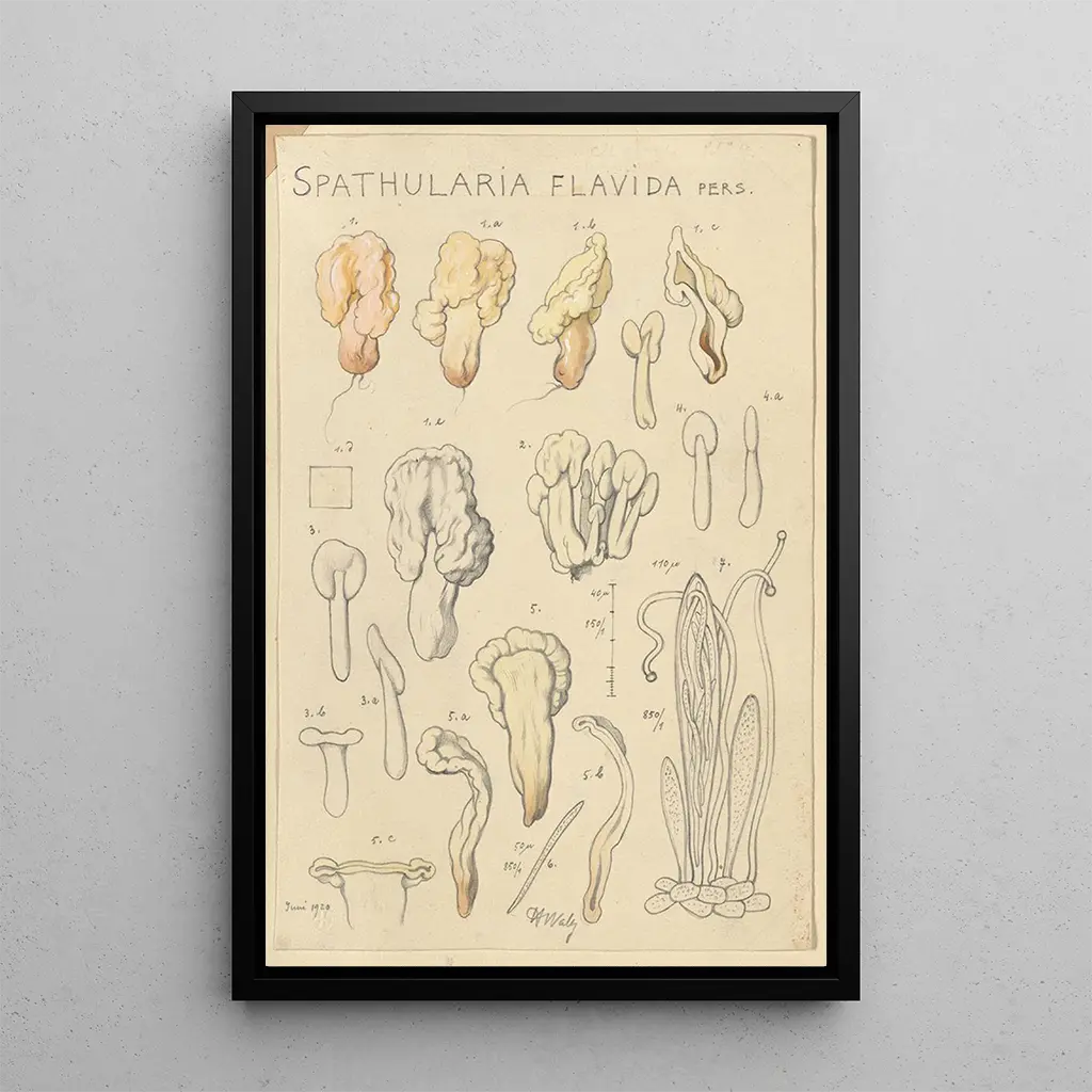 Spathularia flavida, ett fascinerande konsttryck av Hans Baldung, framkallar en unik skönhet genom sina organiska former och delikata färger. Kompositionen, med sina nyanser av grönt och gult, skapar en atmosfär som är både lugnande och fängslande. Baldungs teknik, som blandar realism och stilisering, ger liv åt denna svamp, nästan kännbart. Varje detalj, från konturer till skuggor, bjuder in betraktaren att fördjupa sig i en naturlig värld där magin sker. Detta konsttryck är en verklig hyllning till biologisk mångfald, som fångar själva essensen av flora.