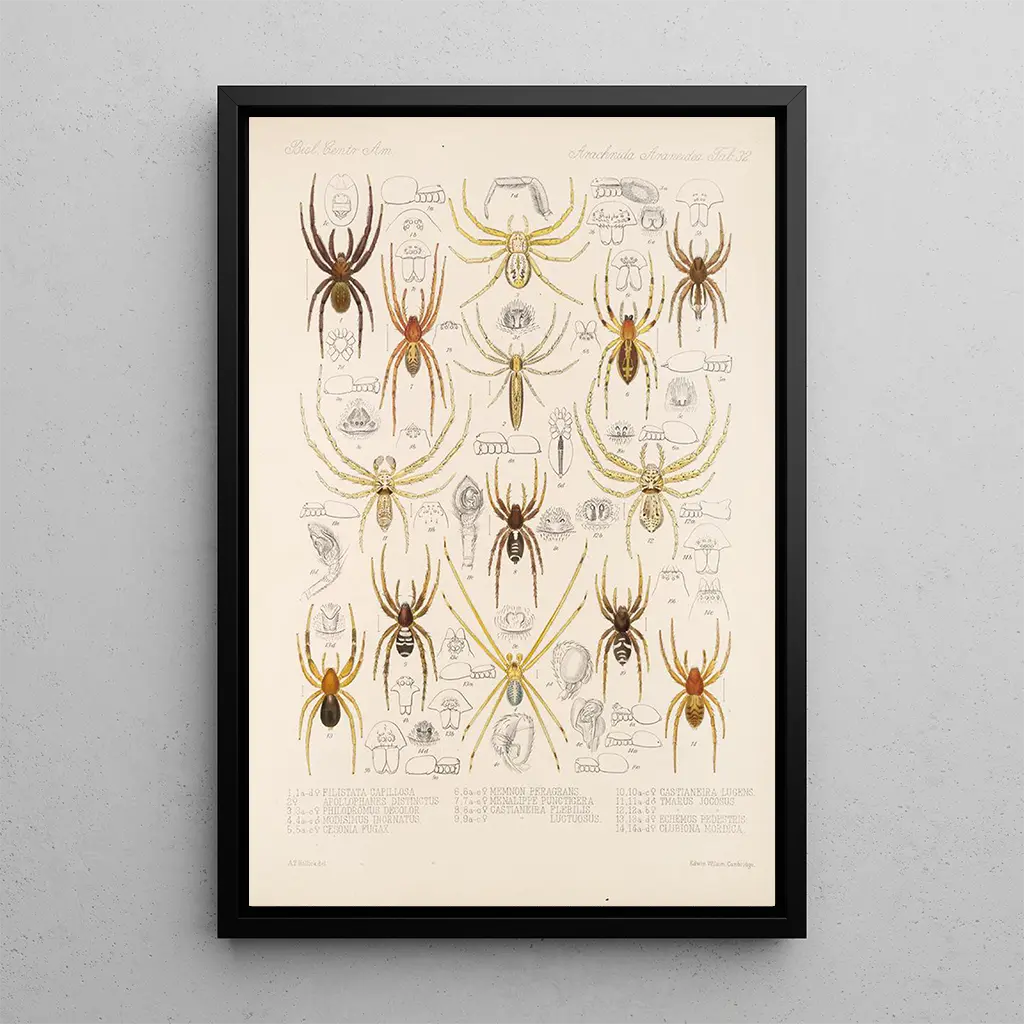 L'œuvre "Arachnida Araneidea Pl 32" av Frederick DuCane Godman fördjupar oss i en fascinerande värld, där spindlarnas elegans lyfts fram. De noggrant utarbetade detaljerna av varje varelse, återgivna med mjuka och naturliga färger, skapar en atmosfär som är både fängslande och lugnande. Tekniken med akvarell, kombinerad med precisa drag, gör det möjligt att fånga essensen av dessa araknidier, och avslöjar deras eleganta former och unika texturer. Detta konsttryck inbjuder till en noggrann eftertanke, där varje element verkar berätta en historia, den om den ofta okända skönheten i spindelvärlden.