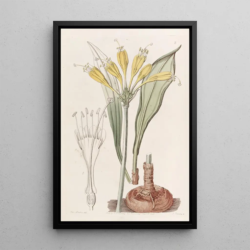 Konsttrycket av Stenomesson jaune d'œuf för oss till en botanisk värld där blommornas skönhet lyfts fram med glans. De livfulla nyanser av gult, kombinerade med gröna toner, skapar en fängslande visuell harmoni. Tekniken av Sydenham Edwards, som förenar precision och känslighet, gör det möjligt att återge varje detalj av denna växt med en anmärkningsvärt finstämdhet. Atmosfären som denna konstnärliga skapelse utstrålar är både glad och lugnande, inbjudande till en noggrann betraktelse av den naturliga prakt.