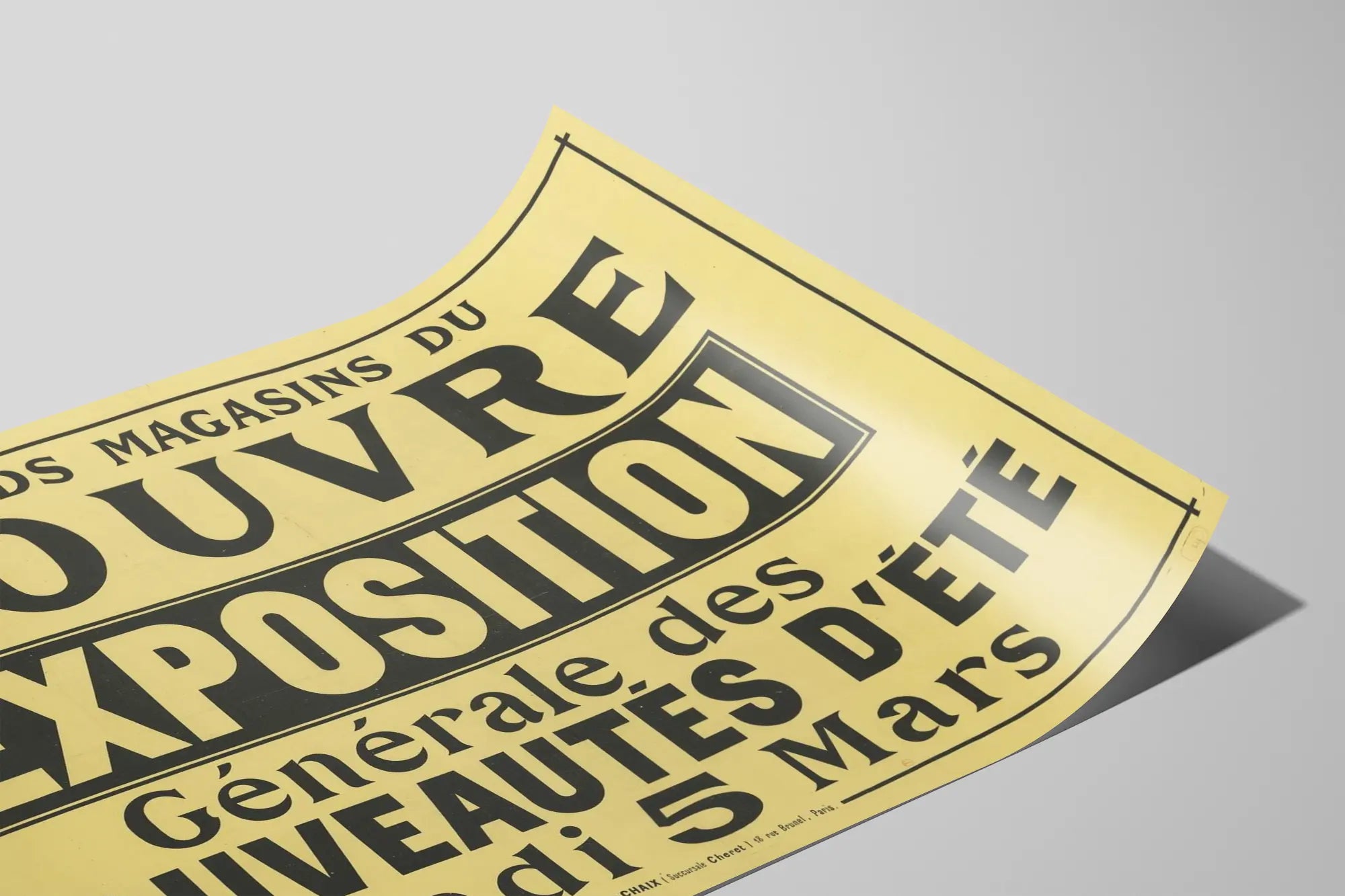 Denna vintageaffisch för Grand Magasins du Louvre är ett ikoniskt väggdekorationselement. Med sin grafiska design i svart på gul bakgrund, annonserar den en allmän utställning som presenterar sommarens nyheter, planerad till måndagen den 5 mars. Denna reklamaffisch, i gammal stil, påminner om elegansen i de kommunikationskampanjer som de stora parisiska varuhusen använde förr i tiden. Perfekt för att pryda en vägg med en retro och äkta känsla, passar denna affisch perfekt in i en värld av vintage- eller industriell inredning. Dess stora format och dess typografi i versaler ger ett starkt visuellt intryck, för den som vill ha en originell väggdekoration med historia. Denna reklamtavla inbjuder till att återupptäcka en historisk kommersiell sida av Paris, samtidigt som den är ett modernt dekorativt inslag. Oavsett om det är i ett vardagsrum, ett kontor eller en butik, utmärker sig denna affisch med sin enkla men effektiva typografiska stil och sitt tydliga, balanserade layout. Ett perfekt val för konstälskare och unika väggdekorationer som vill tillföra en tidsenlig charm till sitt hem.