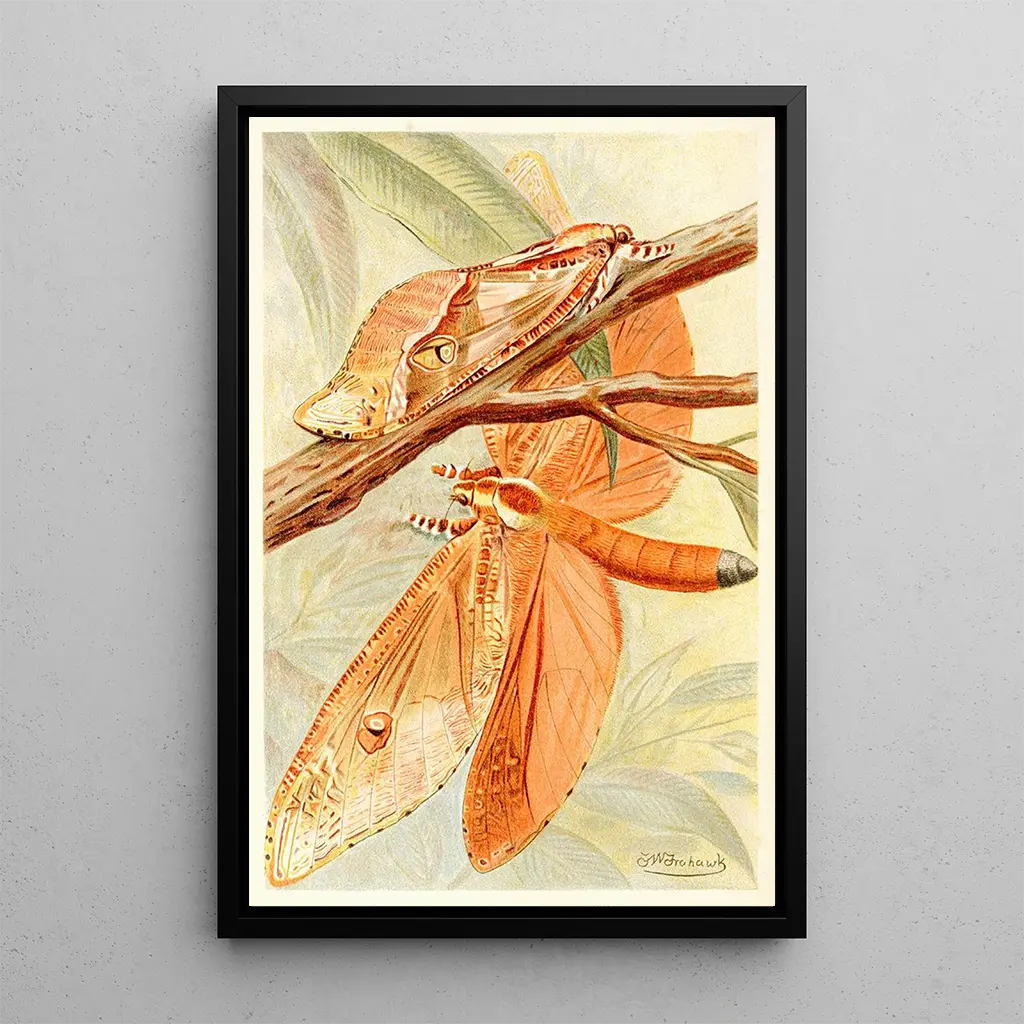 Konsttrycket "Grand Sphinx Mite" av Frederick William Frohawk är en hyllning till insekternas skönhet, som noggrant fångar de delikata detaljerna hos denna fascinerande insekt. Kompositionen framhäver Sphinx Mite i en majestätisk pose, omgiven av en naturlig miljö rik på livfulla färger. De gröna och bruna nyanserna blandas harmoniskt och skapar en atmosfär som är både lugn och dynamisk. Frohawks teknik, som förenar realism och känslighet, gör det möjligt att uppskatta texturen på vingarna och de finstämda mönstren, vilket inbjuder betraktaren att fördjupa sig i den fascinerande världen av fjärilar och nattfjärilar.