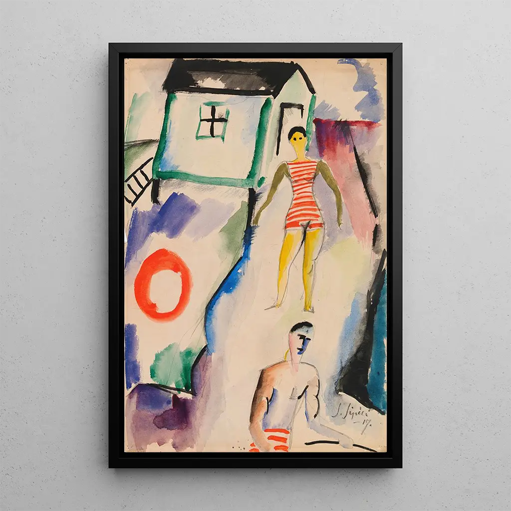 Konsttrycket av verket Plage av Sulho Sipilä fångar essensen av en solig dag vid havet. De gyllene nyanserna av sanden blandas med de djupa blå tonerna i vattnet, vilket skapar en slående kontrast som drar till sig blickar. Sipiläs teknik, kännetecknad av flytande och uttrycksfulla penseldrag, ger liv åt denna badortsscen, där vågornas rörelse nästan känns påtaglig. Varje element, från parasoller till simmarens silhuetter, bidrar till en glad och livfull atmosfär, som inbjuder betraktaren att känna värmen från solen och det mjuka ljudet av vågorna.