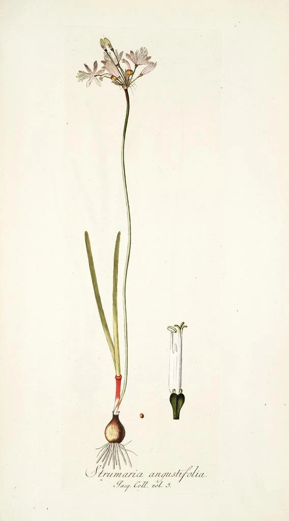 Nikolaus Joseph Freiherr von Jacquin, botanist och konstnär från 1700-talet, lyckades förena sina passioner för botanik och konst. Hans utforskningar i Amerika och Sydafrika berikade hans kunskaper och påverkade hans verk. Genom att skapa konsttryck som det av Strumaria angustifolia, har Jacquin gjort det möjligt för allmänheten att upptäcka sällsynta arter. Hans vetenskapliga tillvägagångssätt, blandat med en konstnärlig känslighet, gjorde honom till en pionjär inom botanisk illustration, och hans bidrag markerar hans tid med en unik insats för vetenskapen och konsten.