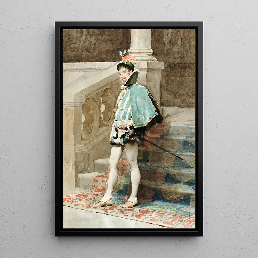 I konsttrycket av verket "Studie av en hovmästare" fördjupar Carlo Randanini oss i den eleganta och fascinerande hovvärlden. Tavlan kännetecknas av rika och djupa färger som framhäver den aristokratiska karaktären hos motivet. Randaninis teknik, som blandar noggranna detaljer och skuggspel, skapar en atmosfär som är både intim och högtidlig. Hovmästaren, klädd i praktfulla kläder, tycks fånga betraktarens uppmärksamhet och inbjuder till att upptäcka hemligheterna i hans värld. Detta konsttryck väcker inte bara yttre skönhet, utan också komplexiteten i dåtidens sociala relationer.