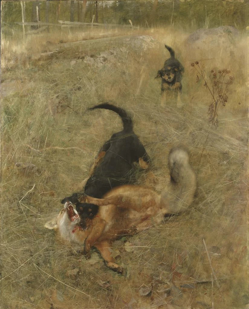 Målning av svensk foxhound och räv - Bruno Liljefors | Konsttryck