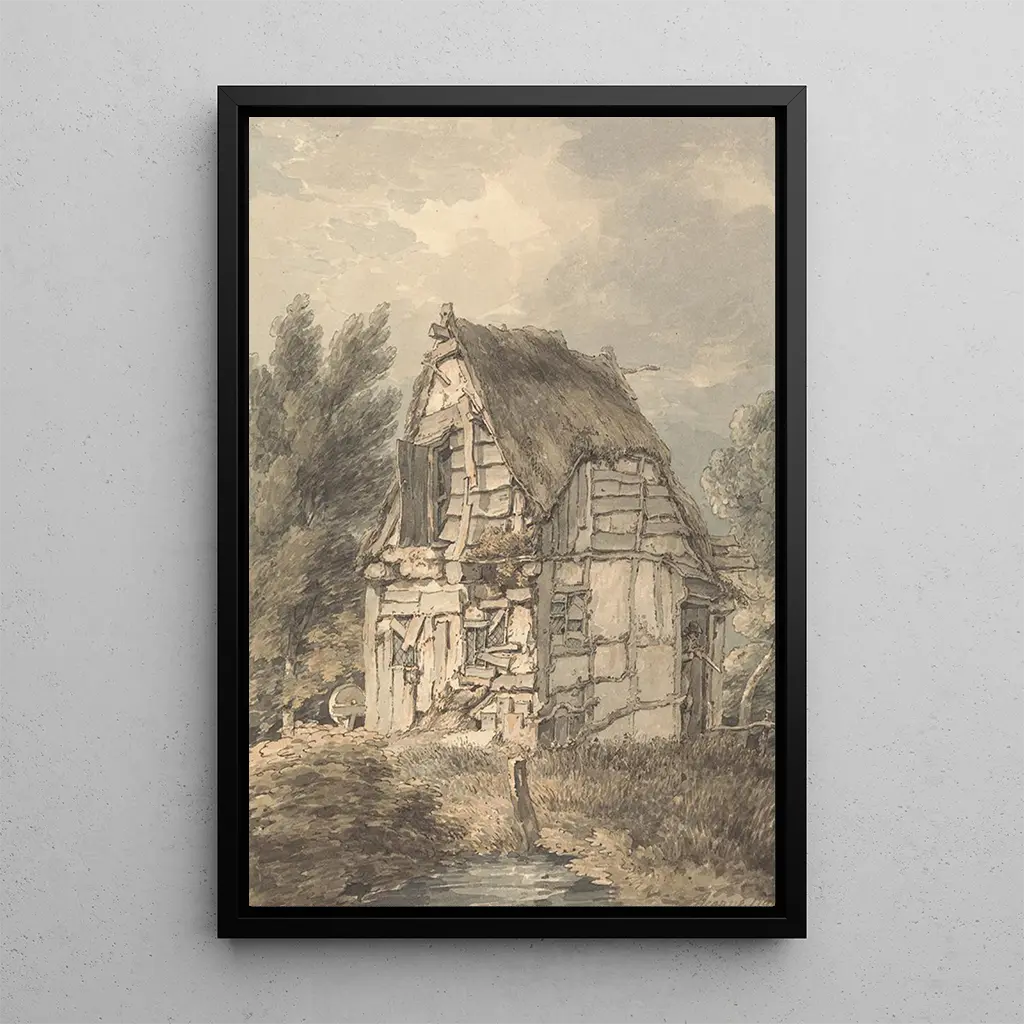 Konsttrycket av Cabane à colombages och med ett halmtak av Thomas Hearne framkallar en idyllisk och lugn atmosfär. De mjuka och jordnära nyanserna, som blandar grönt, brunt och beige, skapar harmoni med den omgivande landskapet. Hearnes teknik, kännetecknad av delikata penseldrag, ger liv åt denna rustika scen, där varje detalj, från halmtaket till de traditionella väggarna, verkar berätta en historia. Detta konsttryck inbjuder till eftertanke och förflyttar betraktaren till en värld där enkelhet och naturens skönhet möts.