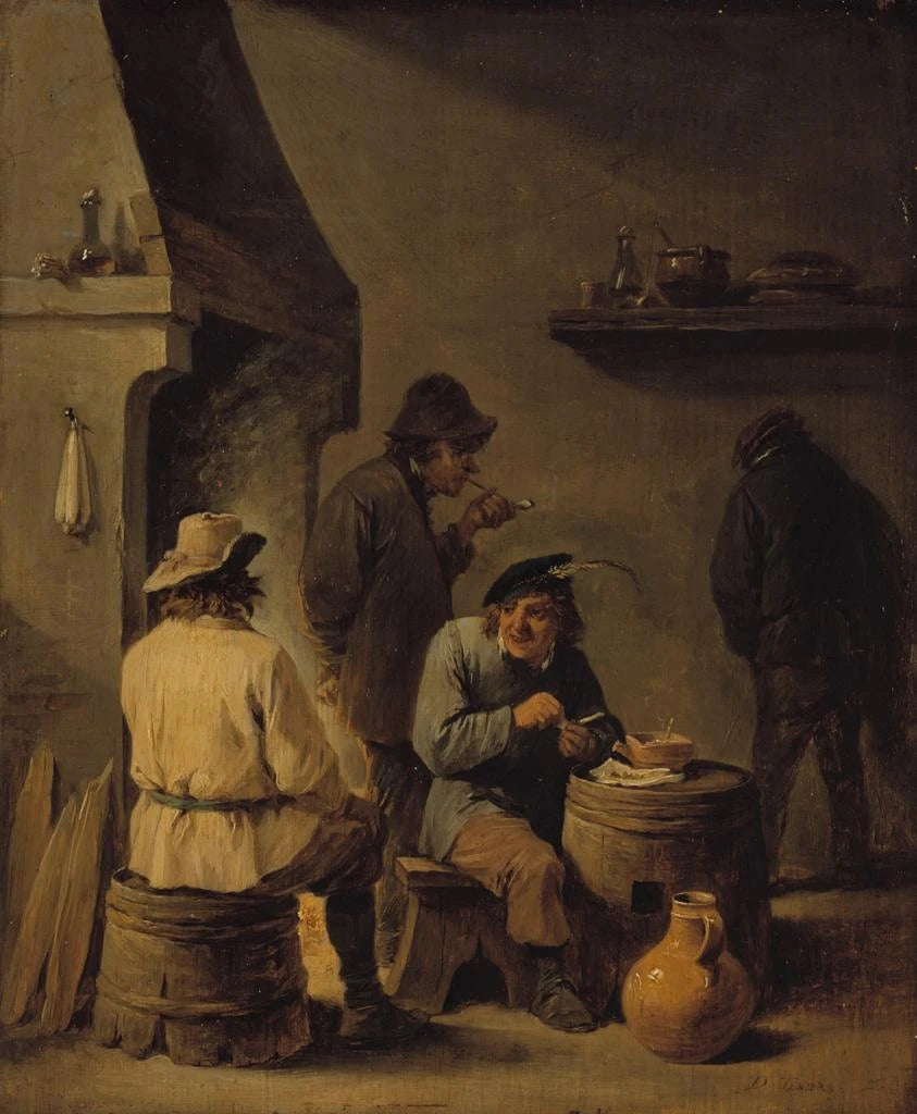 Teniers stil kännetecknas av en slående realism, som manifesterar sig genom noggranna detaljer och en palett av varma, jordnära färger. I "La tabagie" är varje person noggrant återgiven, från ansiktsuttryck till kläder, vilket vittnar om en noggrann observation av vardagen. Ljussättning och skuggning, typiska för barockmåleriet, tillför djup till scenen, medan den balanserade kompositionen leder betraktarens blick genom verket. Teniers utmärker sig i att återge texturer, vare sig det är mjukheten hos tyger eller glansen hos metallföremål, vilket skapar en immersiv visuell upplevelse. Detta verk utmärker sig också genom sitt tema, som lyfter fram de enkla nöjena i livet, bortom de storslagna motiv som ofta prioriterades av hans samtida.