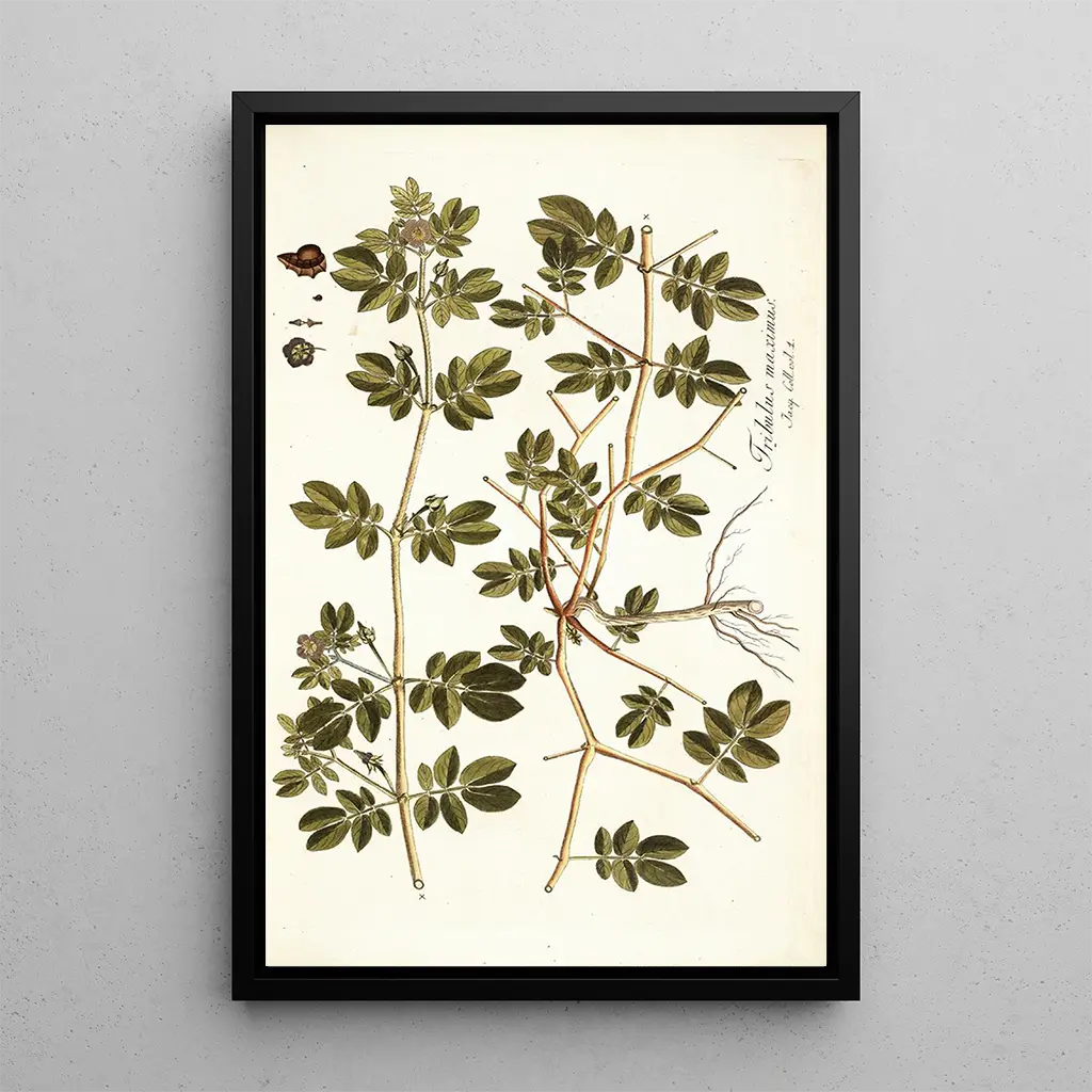 konsttrycket av Tribulus maximus bjuder in oss att upptäcka den råa och vilda skönheten hos denna ikoniska växt. Nikolaus Joseph Freiherr von Jacquin’s verk framhäver de minutiösa detaljerna i bladen och blommorna, och avslöjar en palett av livfulla färger som sträcker sig från djupgrönt till glänsande gult. Den dynamiska kompositionen i denna målning framkallar naturens styrka och motståndskraft, samtidigt som den förmedlar en atmosfär av lugn. Tack vare akvarelltekniken framställs varje element med fin känsla, vilket ger en realistisk och konstnärlig bild av denna växtart.