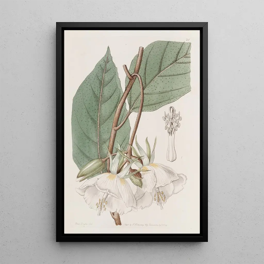 La konsttryck av Trochetia à grandes fleurs fördjupar oss i en frodig värld där naturen uttrycker sig med glans. De livfulla nyanserna av rött och grönt blandas harmoniskt, vilket skapar en vibrerande och varm atmosfär. Akvarelltekniken, som används av Sydenham Edwards, möjliggör fångsten av blommornas delikata struktur samtidigt som den ger en fascinerande djupkänsla. Varje detalj, från bladnervarnas till skuggorna, vittnar om en noggrann blick på växternas skönhet. Detta konsttryck inbjuder till eftertanke, och framkallar exotiska landskap och den biologiska mångfaldens rikedom.