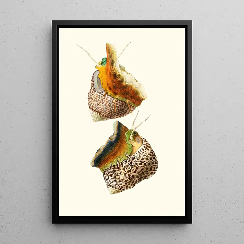 Konsttrycket av Trochus turbinas och Trochus articulatus fördjupar oss i en fascinerande marin värld. Dessa snäckor, med sina spiralformade former och nyanser av färger som sträcker sig från beige till brunt, framkallar skönheten i havets bottnar. Tekniken för avbildning framhäver de noggranna detaljerna i deras textur, vilket skapar en atmosfär som är både lugnande och fängslande. Varje snäcka verkar berätta en historia, en inbjudan att utforska havets mysterier och att uppskatta den marina mångfalden.