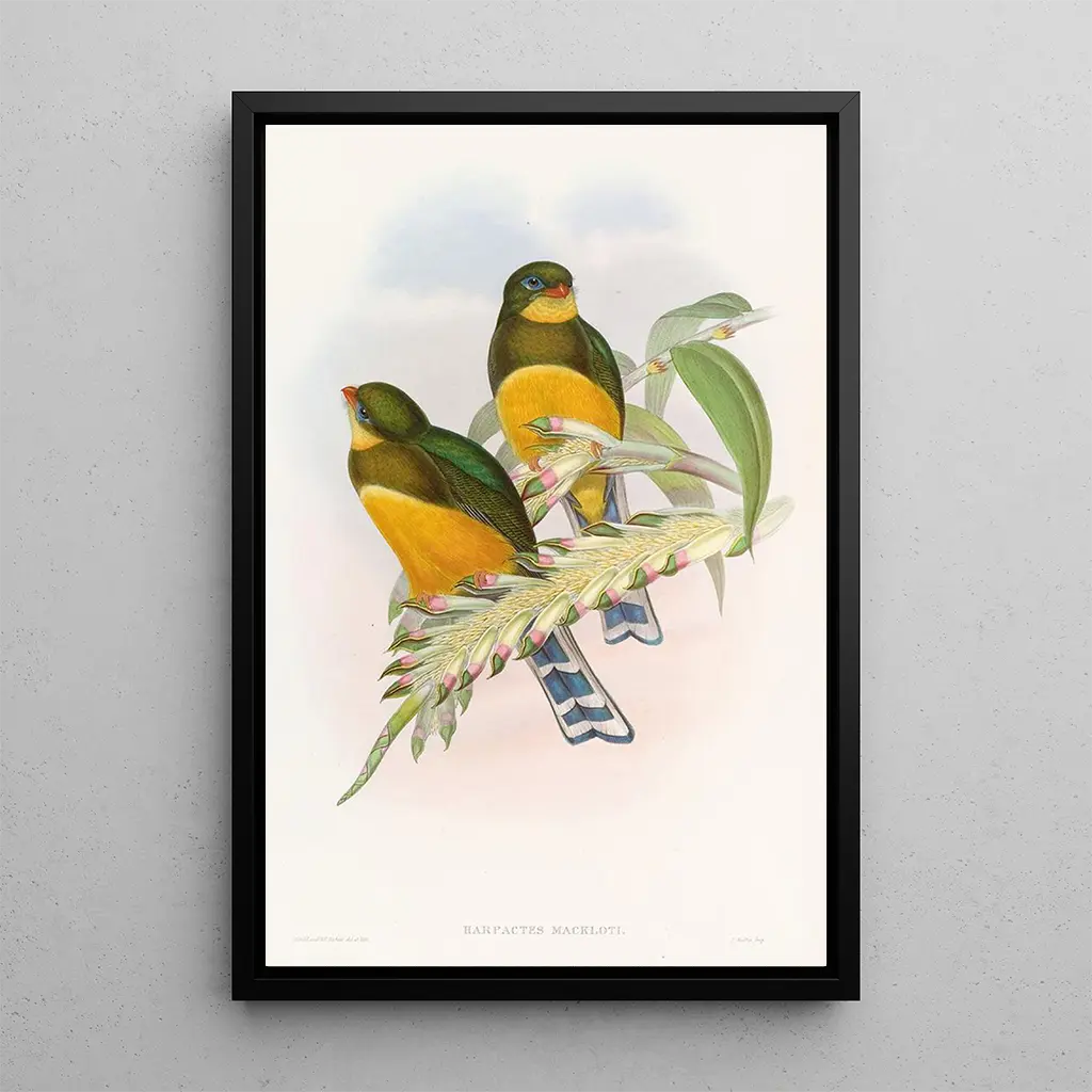John Gould, född 1804, anses vara en av de största ornitologerna under sin tid. Hans arbete påverkades av hans resor runt om i världen, där han observerade och dokumenterade sällsynta fågelarter. Aktiv under viktoriansk tid, publicerade Gould många illustrerade verk, inklusive "The Birds of Australia" och "The Birds of Europe", som har satt avtryck i ornitologins historia. Hans passion för fåglar och hans noggrannhet i detaljer har gjort honom till en ikonisk figur, och hans illustrationer fortsätter att inspirera konst- och naturälskare. Trogon de Macklot är ett perfekt exempel, som förenar vetenskap och estetik.