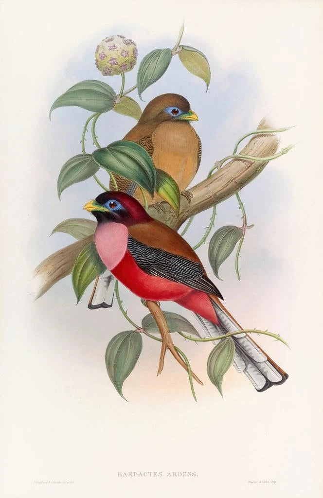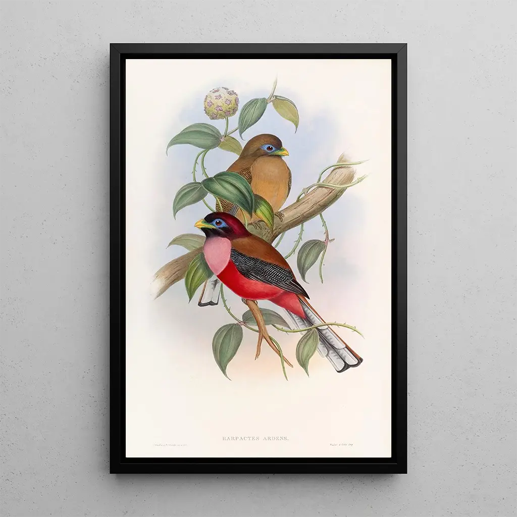 John Gould, verksam under 1800-talet, är erkänd som en pionjär inom ornitologisk illustration. Hans passion för fåglar ledde honom att resa världen runt, samla in exemplar och information för sina verk. Påverkad av tidens vetenskapliga upptäckter, lyckades han kombinera precision och estetik i sina illustrationer. Trogon à poitrine rose är ett av hans mästerverk, som vittnar om hans engagemang för att skildra naturens skönhet samtidigt som han bidrar till ornitologisk vetenskap. Hans arv består, och inspirerar konst- och naturälskare.