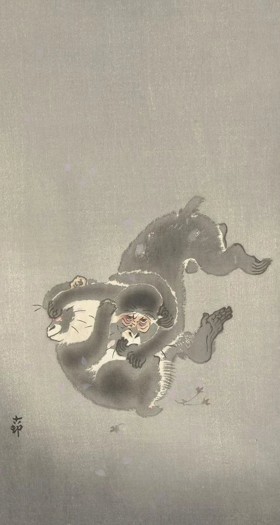 Konsttrycket "Deux singes jouant" av Ohara Koson skildrar en charmig och livfull scen. Singarna, fångade i ett lekfullt ögonblick, illustrerar glädje och obekymradhet i naturen. De klara färgerna och de noggrant utarbetade detaljerna i deras päls skapar en dynamisk och engagerande atmosfär. Tekniken med ukiyo-e, med sina flytande linjer och subtila övergångar, ger liv åt denna lekfulla interaktion. Varje element, från det omgivande lövverket till singarnas uttryck, bidrar till en harmonisk komposition som fångar ögat och inbjuder till drömmande reflektion.