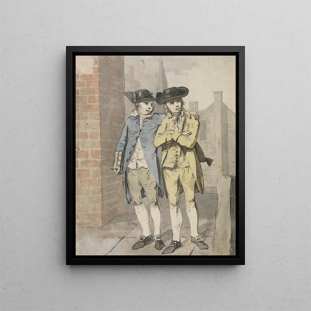 L'œuvre "Deux skolbarn" av Elias Martin är en inbjudan att fördjupa sig i den känsliga och intima världen av barndomen. Denna tavla, som utspelar sig med en tydlig ömhet, fångar ett tillfälligt ögonblick mellan oskuld och nyfikenhet. I en scen där två unga pojkar står sida vid sida, lyckas konstnären framkalla en atmosfär av kamratskap, samtidigt som den avslöjar nyanser av deras personligheter genom deras uttryck och kroppsspråk. Det mjuka ljuset som badar kompositionen förstärker känslan av frid, och gör betraktaren till ett vittne till en äkta samhörighet. Detta konstverk begränsar sig inte till en enkel skildring av barndomen, utan tar oss istället med på en reflektion över tidens gång och skönheten i mänskliga relationer.