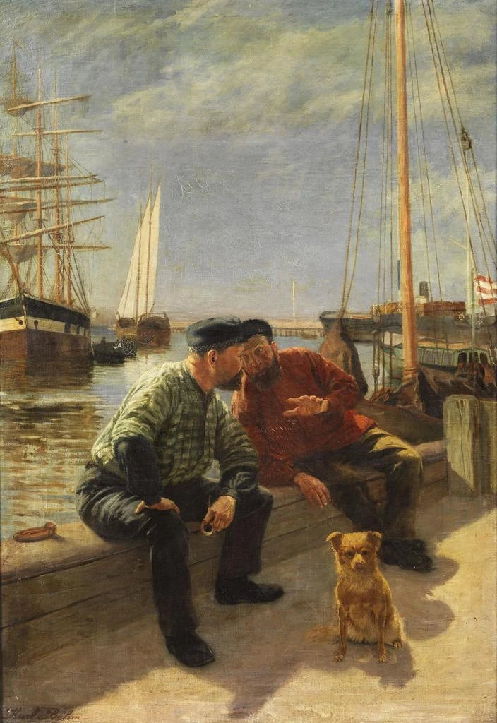 I "Deux fiskare på kajen" fördjupar Karl Behm oss i en maritim atmosfär fylld av lugn. Tavlan skildrar två män, fokuserade på sitt arbete, omgivna av nyanser av blått och grönt som framkallar havet och den omgivande naturen. Ljuset spelar en avgörande roll, lyser upp fiskarnas ansikten och skapar mjuka skuggor som tillför djup till kompositionen. Behms teknik, som förenar realism och impressionism, ger liv åt denna scen, nästan kännbart ljudet av vågorna och den salta luften.