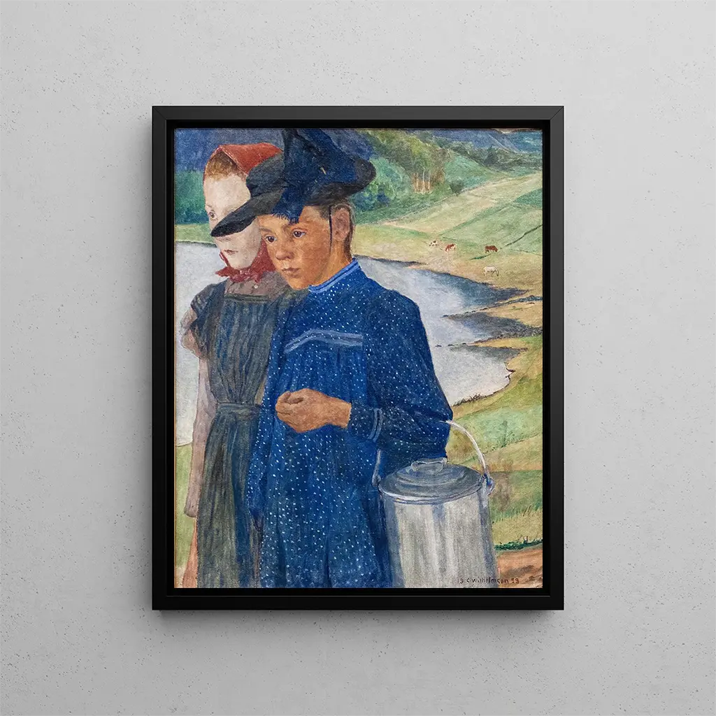 I universum rikt och fascinerande konst, lyckas vissa verk fånga själva essensen av mänskligheten genom scener ur vardagen. "Två flickor på vägen", utfört av Carl Wilhelmson, är ett av dessa konsttryck som väcker en mild melankoli och en tidlös skönhet. Denna målning, som breder ut sig i hjärtat av en livfull natur, lyfter fram barndomens samhörighet och obekymradhet, samtidigt som den bjuder in betraktaren att fördjupa sig i en värld fylld av nostalgi. Konstnären, med en palett av delikata färger och subtilt ljus, lyckas skapa en atmosfär som är både lugnande och suggestiv, där varje detalj verkar berätta en historia. Stil och unikhet i konsttrycket Carl Wilhelmsons stil utmärker sig genom sin impressionistiska ansats, där ljus och färg spelar en avgörande roll. I "Två flickor på vägen" är kompositionen noggrant orkestrerad, med fokus på de två huvudpersonerna som tycks röra sig i ett utrymme som är både intimt och öppet. Nuancer av grönt och blått, kombinerat med guldglänsande ljusinslag, ger konstverket en nästan drömlik dimension. Flickornas ansikten, varsamt skissade, uttrycker ett spektrum av känslor, från glädje till eftertanke. Wilhelmson lyckas fånga det flyktiga ögonblicket av barndomen, en period då varje stund är fylld av magi och upptäckter. Flödet i linjerna och lättheten i formerna vittnar om en teknisk skicklighet som transcenderar enkel realism för att erbjuda en poetisk syn på livet. Konstnären och hans inflytande Carl Wilhelmson, en framstående figur inom svensk konst under början av 1900-talet, lyckades göra sig gällande tack vare sin talang och sin känslighet. Utbildad vid Kungliga Akademien för de fria konsterna i Stockholm, påverkades han av de stora mästarna inom impressionismen, samtidigt som han utvecklade en egen stil. Hans konst präglas av en ständig strävan efter ljus och färg, element som han anser vara avgörande för att framkalla mänskliga känslor. Wilhelmson var också en passionerad försvarare av naturen, ofta avbildad i hans målningar som en egen karaktär. Hans påverkan på sina samtida