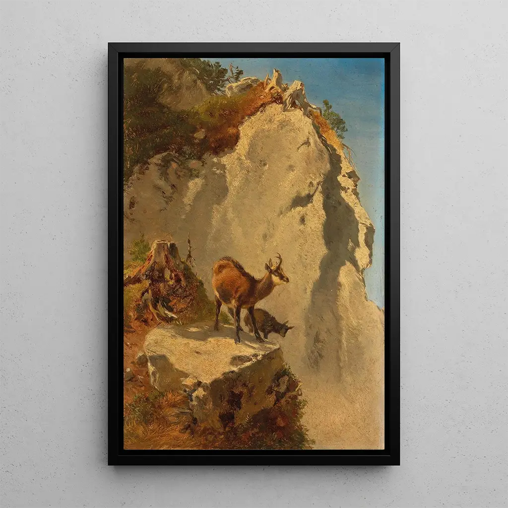 La konsttryck av målningen Deux chamois en haute montagne av Anton Schrödl fördjupar oss i de majestätiska landskapen i Alperna. Chamois, ikoniska figurer i denna region, är avbildade med en anmärkningsvärt noggrann detaljrikedom, som rör sig i en vild och storslagen miljö. Nyanser av grönt och brunt, kombinerade med vita inslag för de snötäckta topparna, skapar en slående kontrast som framhäver den naturliga skönheten i den alpina faunan. Konstnärens teknik, som förenar realism och känslighet, gör det möjligt att känna den friska bergsluften och äktheten i denna scen.