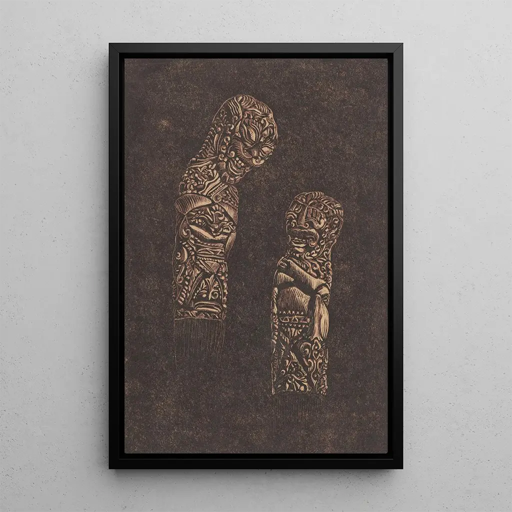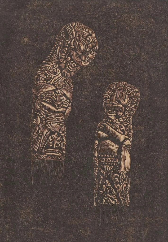 La konsttryck Deux poignées de kriss de Reijer Stolk nous plonge dans un univers où les formes et les textures s’entrelacent avec délicatesse. Les poignées, finement sculptées, sont mises en valeur par un jeu de lumière subtil qui souligne leur élégance. Les couleurs, principalement des tons sombres rehaussés de reflets dorés, créent une atmosphère mystérieuse et captivante. La technique de Stolk, qui mêle réalisme et sensibilité, invite le spectateur à contempler non seulement l’objet, mais aussi l’histoire qu’il véhicule, évoquant un héritage culturel riche et fascinant.
