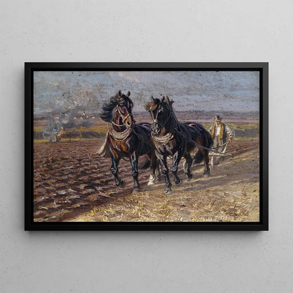"Deux chevaux noirs à la charrue" est une œuvre qui dépeint avec force la relation entre l'homme et l'animal dans le contexte agricole. Les chevaux, majestueux et robustes, sont représentés dans une posture dynamique, tirant la charrue à travers un champ fertile. Les couleurs sombres des animaux contrastent avec les teintes terreuses du sol, créant un équilibre visuel saisissant. La technique de peinture, probablement à l'huile, permet de rendre les détails des muscles des chevaux et la texture de la terre, évoquant à la fois la force et la beauté de la nature.