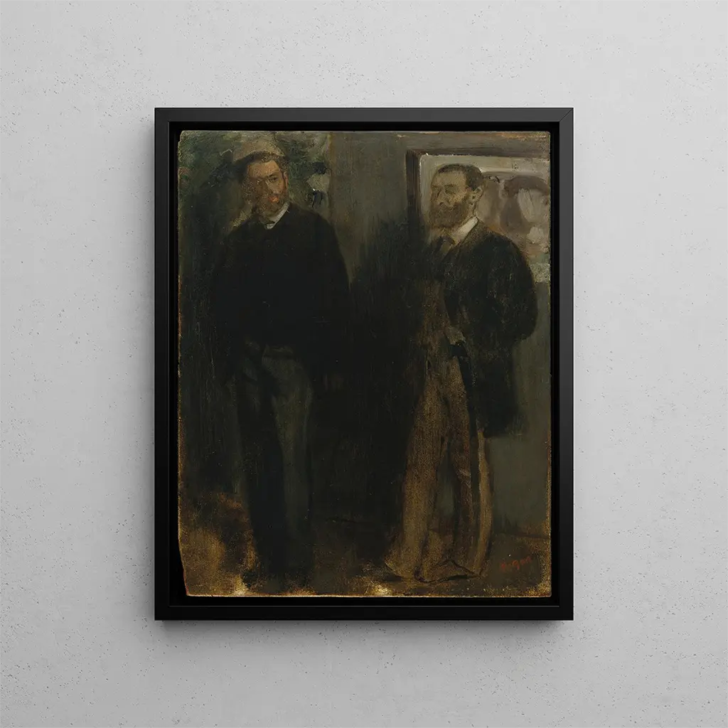 I konstvärlden kan vissa verk fånga ögonblick av intimitet och samhörighet, och går bortom det enkla ramverket av en målning. "Två män - Edgar Degas" är ett av dessa verk som, genom sin emotionella djup och subtila atmosfär, bjuder in oss att utforska mänskliga relationer genom det konstnärliga blickfånget. Denna målning, både enkel och komplex, skildrar en vardagsscen där två manliga figurer möts, djupt försjunkna i en konversation som tycks hänga i luften. Ljuset, skuggorna och de noggranna detaljerna bidrar till att skapa en visuell berättelse som engagerar och fascinerar oss.