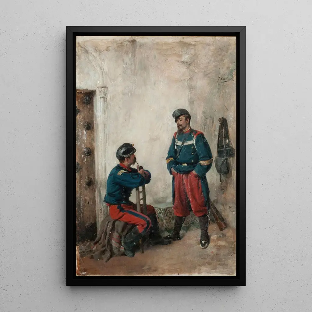 I verket "Deux soldats" fångar José Benlliure y Gil ett ögonblick av samhörighet mellan två militärer. Kompositionen präglas av varma, jordnära färger som framkallar den spanska solens värme. Detaljerna i uniformerna, målade med en anmärkningsvärt noggrann precision, vittnar om konstnärens skicklighet. Atmosfären som avtecknar sig i denna målning är både högtidlig och fylld av kamratskap, vilket inbjuder betraktaren att reflektera över soldaternas uppoffring och heroism. Varje utbytt blick mellan protagonisterna verkar berätta en historia, vilket gör detta konsttryck särskilt rörande.