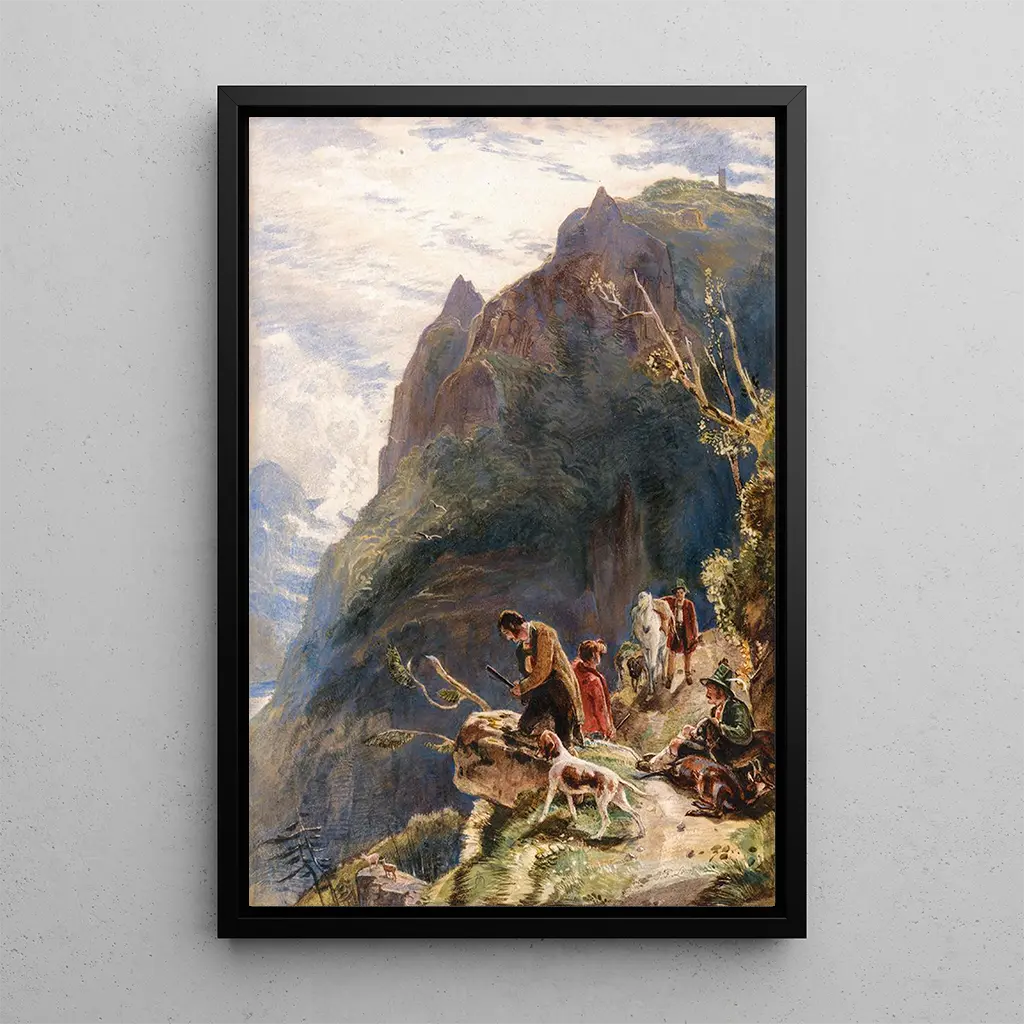 I detta fängslande verk fördjupar sig John Frederick Lewis i hjärtat av de majestätiska Alperna, där tyrolska jägare, klädda i traditionella dräkter, står stolt. Kompositionen är rik på detaljer, varje element är noggrant återgivet med en anmärkningsvärt precision. Färgerna, från de djupa gröna i bergen till de varma bruna i kläderna, skapar en atmosfär som är både livfull och lugn. Akvarelltekniken, som Lewis behärskar, möjliggör fångst av ljus och skugga, vilket tillför en nästan taktil dimension till scenen. Detta konsttryck väcker en inbjudan att utforska den vilda skönheten och kulturen hos tyrolarna.