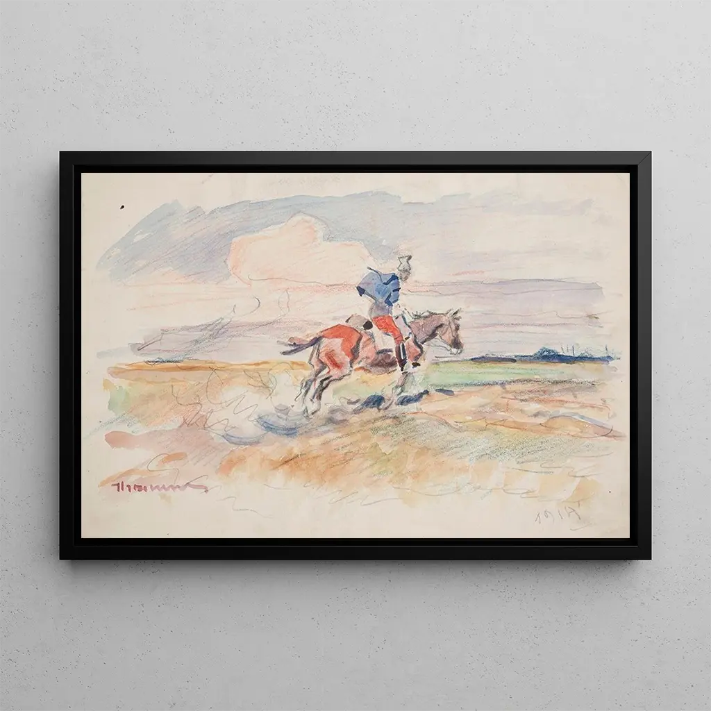 "Un Cavalier Autrichien sur un Cheval" d'Ivan Ivanec capture un moment de bravoure et de noblesse, où le cavalier, fier et majestueux, se dresse sur son destrier. Les détails minutieux de l'uniforme et la posture dynamique du cheval témoignent d'une maîtrise technique impressionnante. La palette de couleurs, dominée par des tons terreux et des éclats de lumière, évoque la grandeur des paysages autrichiens. Cette toile transporte le spectateur dans un passé glorieux, où l'héroïsme et l'élégance se rencontrent dans une danse visuelle captivante.