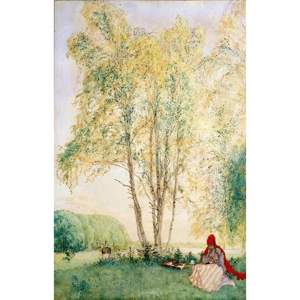 Carl Larsson, figure emblématique du mouvement artistique suédois à la fin du XIXe siècle, a su capturer l’essence de la vie quotidienne avec une sensibilité unique. Né en 1853, il a été influencé par le mouvement Arts & Crafts et le préraphaélisme, intégrant des éléments de ces styles dans son propre travail. Larsson a également été un précurseur du design intérieur, transformant son foyer en un véritable laboratoire artistique. Ses œuvres, souvent inspirées de sa famille et de son environnement, témoignent d’un profond attachement à la nature et à la vie domestique. La konsttryck de Sous les bouleaux illustre parfaitement cette approche, mêlant intimité et nature.
