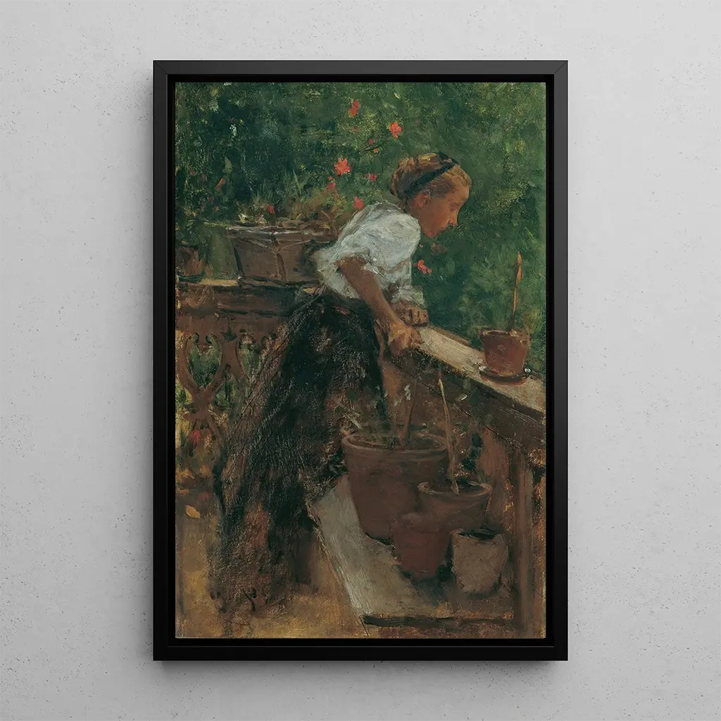 I "Jeune paysanne au balcon" fångar August von Pettenkofen essensen av det enkla och äkta livet genom en ung kvinnas blick. Kompositionen framhäver mjukheten i hennes ansiktsdrag, upplyst av det naturliga ljuset som filtrerar genom dekorens element. Jordnära färger och gröna inslag återspeglar den omgivande naturen, vilket skapar en lugn och kontemplativ atmosfär. Detta konsttryck är en verklig inbjudan att uppskatta skönheten i vardagliga ögonblick, där ungdom och natur möts.