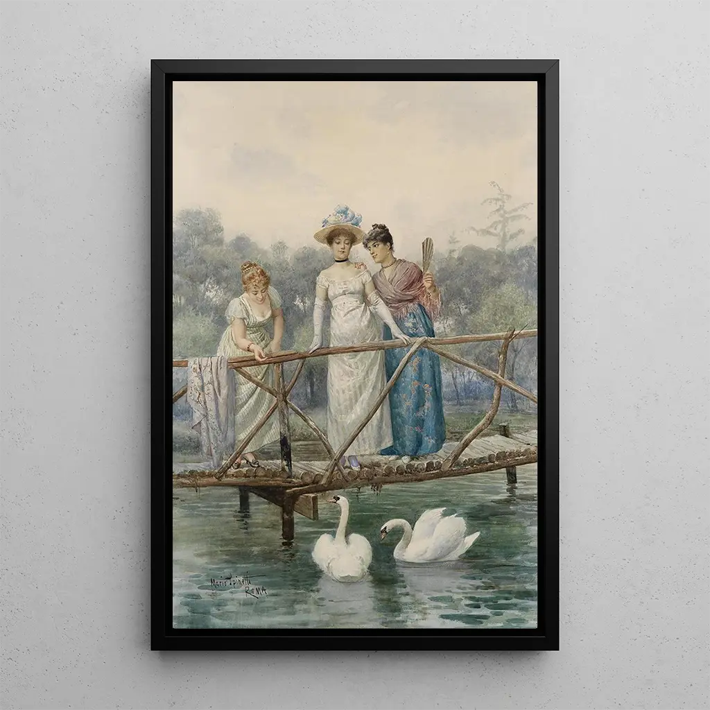 I konsttrycket av verket "Ungdomsflickor som matar svanar" fångar Mario Spinetti ett ögonblick av sötma och samklang med naturen. Pastellfärgerna blandas varsamt, vilket skapar en lugnande atmosfär. De unga kvinnorna, klädda i lätta klänningar, verkar i samklang med svanarna, symboler för grace och skönhet. Spinetti's teknik, som kombinerar oljemålning och impressionistiska drag, ger liv åt denna idylliska scen, där varje detalj, från fåglarnas fjäderdräkt till kvinnornas uttryck, noggrant arbetas för att framkalla en känsla av fred och lycka.