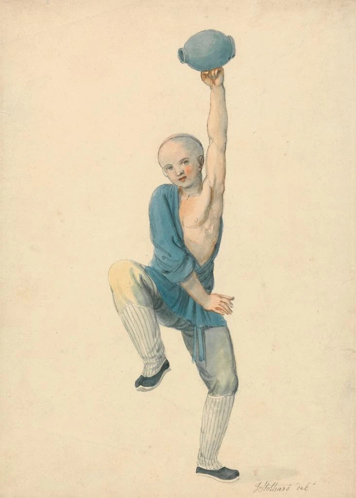 Dans cette œuvre captivante, Thomas Stothard nous présente un jeune Chinois, dont le regard rêveur et la posture délicate évoquent une beauté fragile. Les couleurs douces et pastel, mêlées à des touches de lumière, créent une atmosphère sereine et contemplative. La technique de Stothard, qui mêle aquarelle et gravure, donne vie à ce tableau, rendant chaque détail, du tissu de la robe au sourire subtil du jeune homme, d'une grande finesse. L'œuvre semble inviter le spectateur à plonger dans un monde de douceur et d'évasion, où l'innocence est mise à l'honneur.