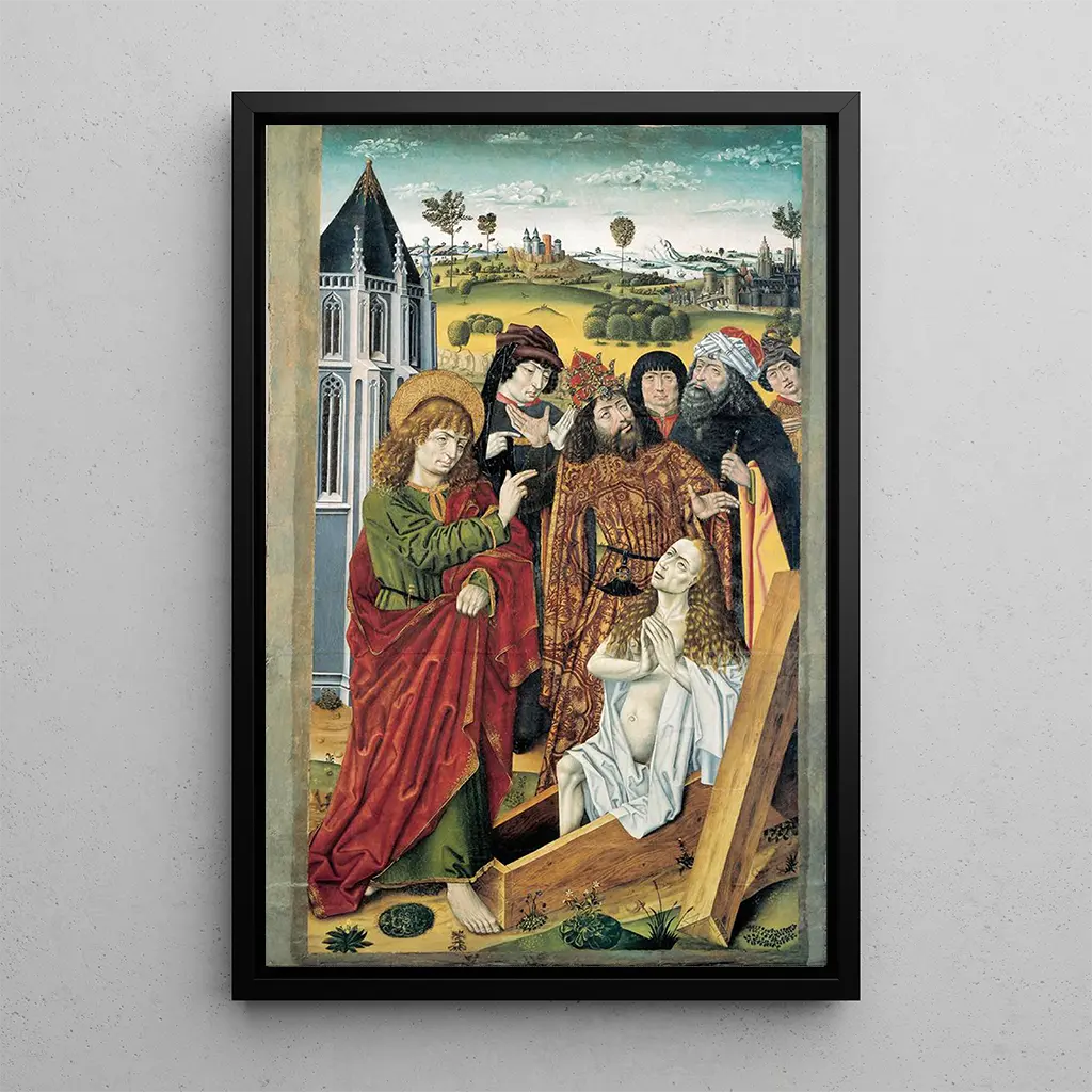 La Résurrection de Drusiana, ett ikoniskt konsttryck av Mästarens av Saint Nicolas, skildrar ett ögonblick av transcendens och mirakel. I denna scen lyser det strålande ljuset upp karaktärernas ansikten, vilket skapar en slående kontrast mot de skuggor som omger dem. De varma färgerna, dominerade av röda och guld, ger en atmosfär av återfödelse och andlighet. Tekniken i konsttrycket, med sina noggranna detaljer och skickliga användning av draperingar, bjuder in betraktaren att fördjupa sig i denna heliga framställning, där livet triumferar över döden.