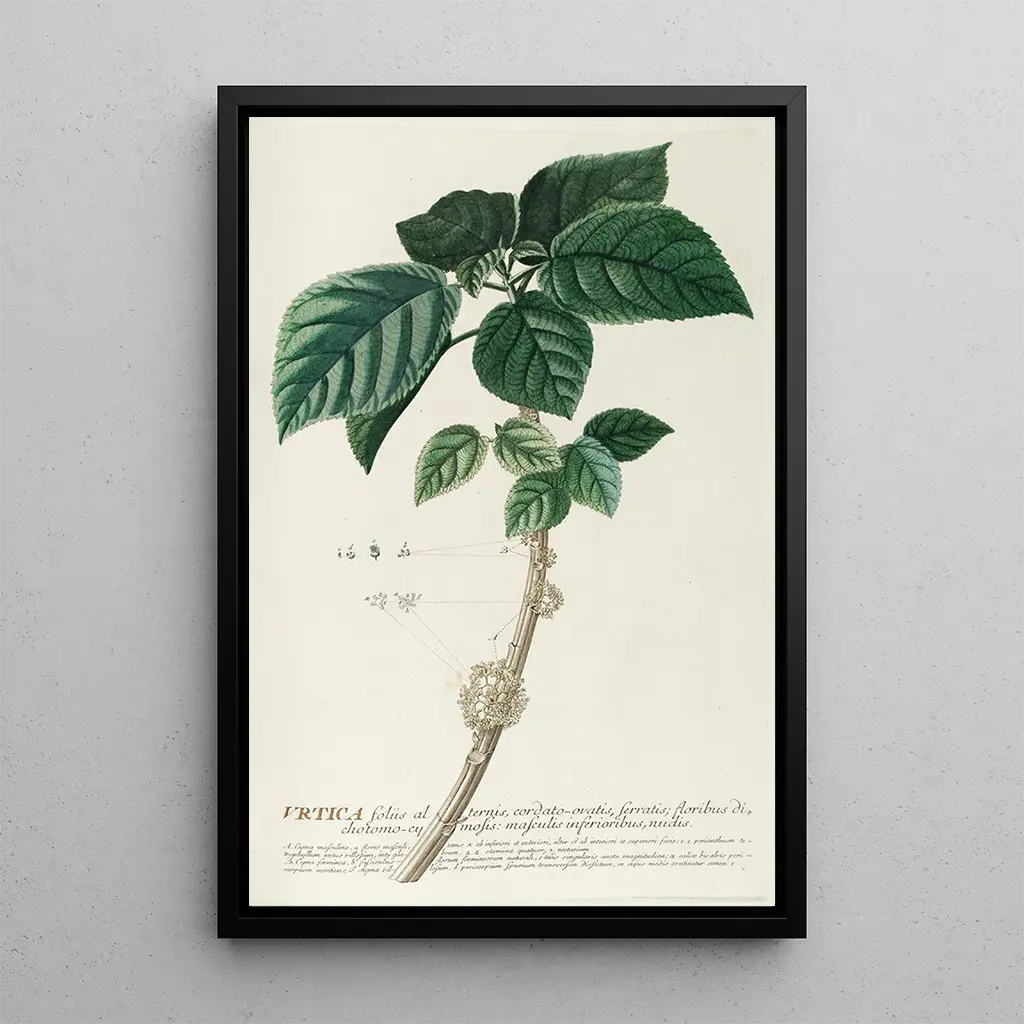 Konsttrycket Urtica av Georg Dionysius Ehret erbjuder en fascinerande syn på brännässlan, som ofta är okänd. Detta verk kännetecknas av noggranna detaljer och färger som framkallar naturens friskhet. De livfulla gröna nyanserna och de gula inslagen lyser upp duken, medan Ehrets precisa teknik framhäver de unika texturerna på bladen. Atmosfären i detta konsttryck är både lugnande och fängslande, inbjuder till noggrann eftertanke av botaniska underverk. Varje element är omsorgsfullt återgivet, vilket vittnar om konstnärens expertis i att observera flora.