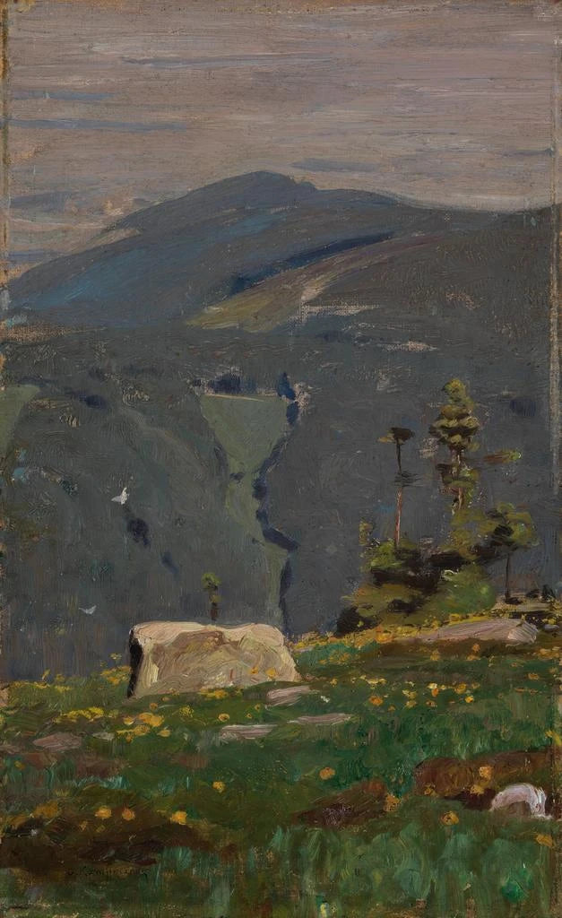 Konsttrycket "Vue depuis la Hornisgrinde" av Gustav Kampmann fördjupar oss i ett bergslandskap fyllt av lugn. Nyansen av grönt och blått blandas harmoniskt, vilket framkallar friskheten från topparna och djupet i dalarna. Kampmanns teknik, som förenar precision och impressionism, skapar en atmosfär av stillhet och eftertanke. De minutiösa detaljerna i träd och moln, kombinerat med ett mjukt ljus, bjuder in betraktaren att fly in i denna bevarade natur. Varje penseldrag verkar fånga själva essensen av den friska bergsluften, och erbjuder en lugnande visuell upplevelse.