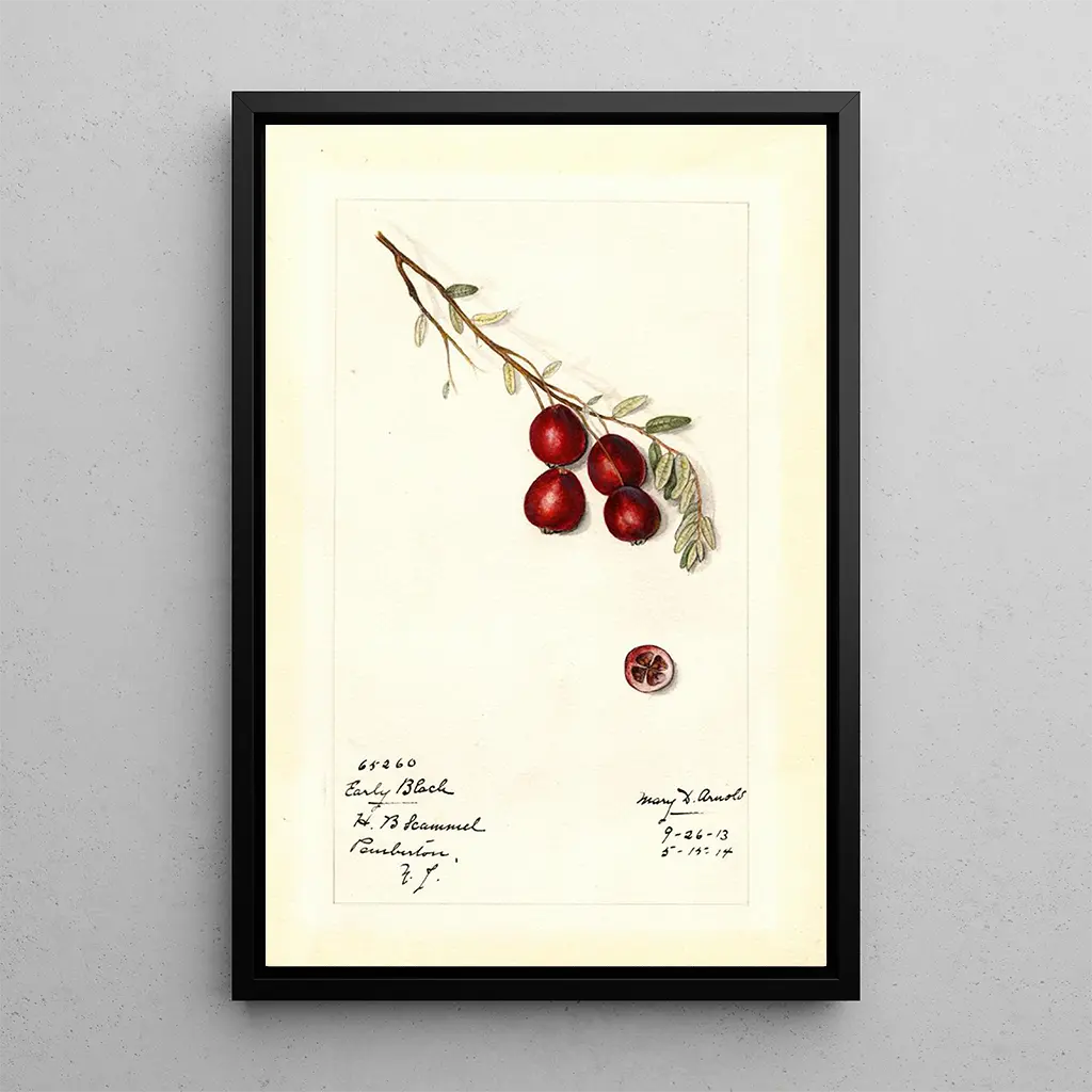 I detta konsttryck av Vaccinium macrocarpon Early Black fördjupar sig Mary Daisy Arnold i en livfull värld där nyanser av rött och grönt vävs samman med elegans. Kompositionen framhäver saftiga, nästan glänsande bär som verkar vara redo att plockas. Konstnärens teknik, som kombinerar akvarell och oljemålning, skapar en atmosfär som är både mjuk och livfull, och framkallar höstens skördefrukt. Varje detalj är noggrant utarbetad och bjuder in betraktaren att beundra den enkla men slående skönheten hos dessa ikoniska frukter.