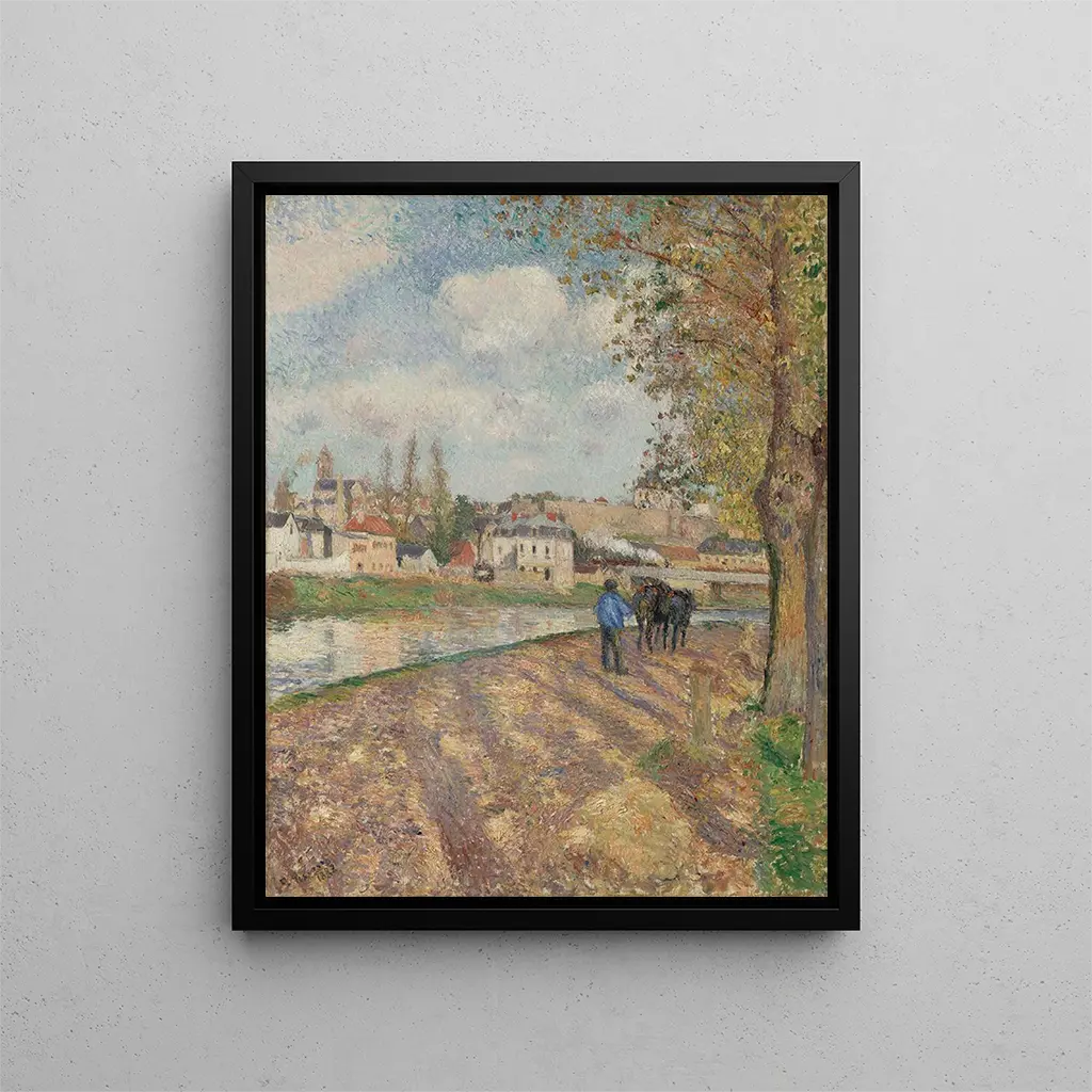 Reproduktion Chemin de l'écluse Saint-Ouen-l'Aumône - Camille Pissarro – Introduktion som fångar intresset L'œuvre "Chemin de l'écluse Saint-Ouen-l'Aumône" av Camille Pissarro är en inbjudan att fördjupa sig i den livfulla världen från slutet av 1800-talet. Denna målning, fylld av ljus och liv, förflyttar betraktaren till ett lantligt landskap där naturen och människans aktivitet vävs samman i harmoni. Pissarro, en ikonisk figur inom impressionismens rörelse, lyckas fånga själva essensen av ett flyktigt ögonblick, fastnat för alltid på duken. Konsttrycket av detta verk gör det möjligt att fullt ut uppskatta den finstämda penseldragningen och den ljusfulla paletten som kännetecknar konstnärens stil. När man betraktar denna scen känner man en djup koppling till det förflutna, som om varje penseldrag berättar en bortglömd historia. Stil och unikhet i verket Pissarro's stil utmärker sig genom sin förmåga att översätta ljus och atmosfär i ett exakt ögonblick. I "Chemin de l'écluse Saint-Ouen-l'Aumône" blandas nyanser av grönt och blått med sådan flyt att de tycks vibrera inför betraktarens ögon. Personerna, även om de ofta är sekundära i hans kompositioner, tillför en mänsklig dimension till landskapet. De framkallar ett enkelt liv, en tillvaro i harmoni med naturen. Vägen som slingrar sig genom målningen blir en metafor för resan, både fysisk och emotionell. Varje detalj, från lövverket till vattnets reflektioner, vittnar om noggrann observation och en känslighet för livets flyktiga skönhet. Detta verk är en sann hyllning till naturen och lugnet, en konstnärlig skapelse som inbjuder till eftertanke. Konstnären och hans inflytande Camille Pissarro, född 1830, anses ofta vara impressionismens fader. Hans nyskapande tillvägagångssätt har djupt påverkat många konstnärer under hans tid och generationer framöver. Pissarro var en passionerad förespråkare för direkt observation av naturen, och hans resor genom Frankrike berikade hans visuella repertoar. Hans förmåga att fånga nyanser av ljus och variationer i färg öppnade vägen för ett nytt sätt att se på världen. Som mentor ledde han vägen för många.