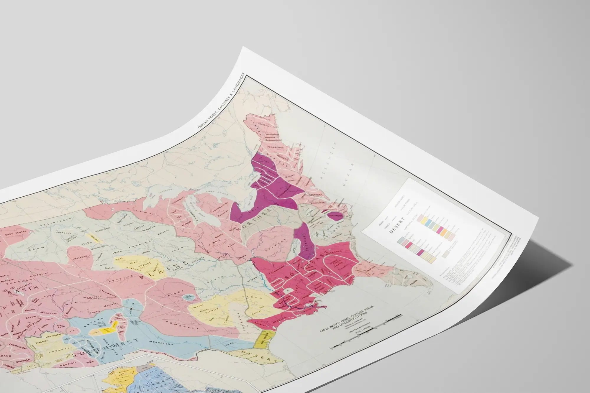 Stammarna är också noggrant avbildade och spridda över sina ursprungsområden, med namn som Navajo, Sioux, Apache, Cherokee och Iroquois, bland många andra. Som komplement finns en legend som visar de olika språkliga grupperna färgkodade, vilket illustrerar den rika mångfalden av amerikanska ursprungsspråk, från Kiowa-Denver till Cherokee och vidare.