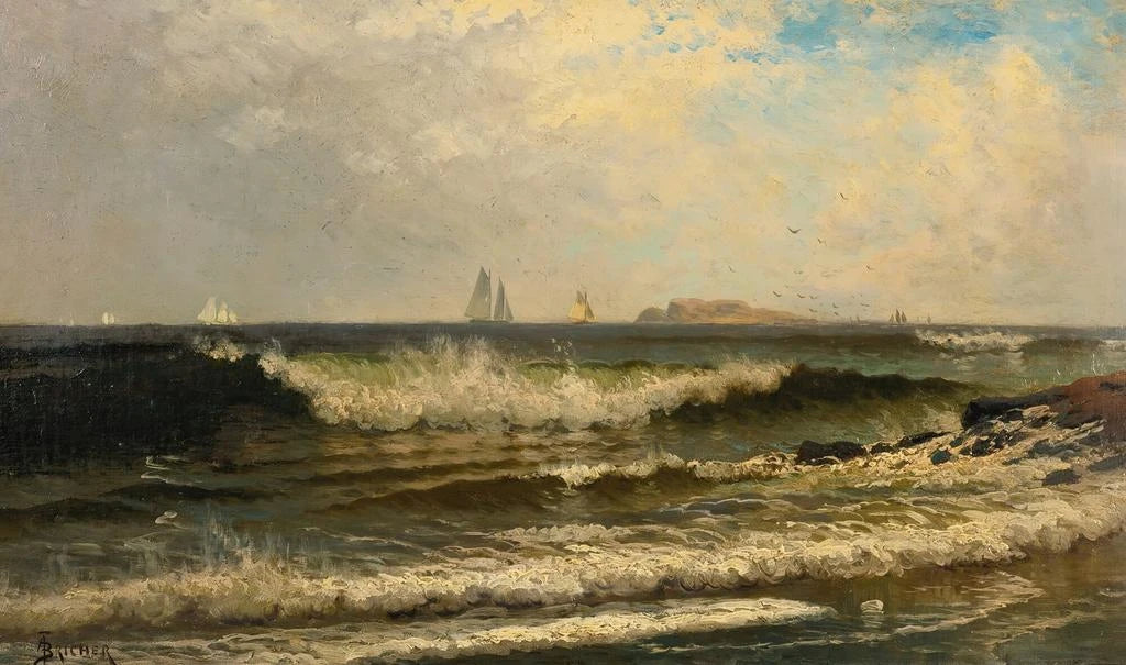 Alfred Thompson Bricher, actif au XIXe siècle, est reconnu pour ses paysages marins qui capturent l'essence même de la mer. Influencé par le mouvement impressionniste, il a su développer un style unique, alliant précision et expressivité. Ses œuvres témoignent d'une profonde admiration pour la nature, souvent inspirées par ses voyages le long des côtes américaines. Bricher a également été membre de l'American Watercolor Society, ce qui témoigne de son importance dans le monde de l'art maritime et de son héritage durable.