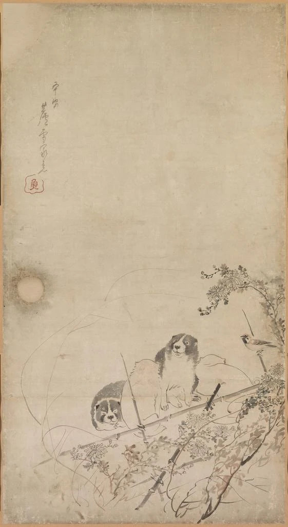 Konsttryck | Valpar, sparvar och krysantemum - Nagasawa Rosetsu