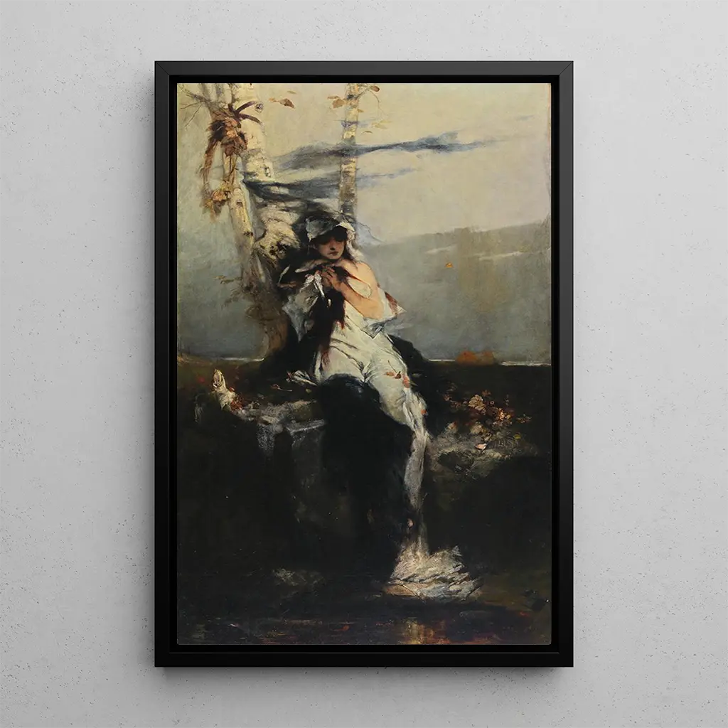 I detta gripande verk, L'Attente, Raphael von Ambros fångar själva essensen av ångest och hopp. Kompositionen, centrerad kring en kvinnlig figur, förstärks av mörka färger och ljusglimtar som framhäver karaktärens inre känslor. Olje-målningstekniken, som behärskas av konstnären, ger en djup och texturerad atmosfär som gör stämningen påtaglig. Varje detalj, från blicken som förlorats i horisonten till veck på kläderna, berättar en historia om väntan och begär, och bjuder in betraktaren att känna denna emotionella spänning.