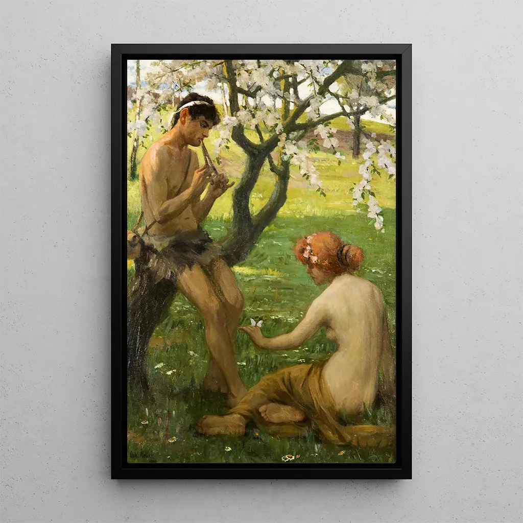 Detta konsttryck av Oskar Heller framkallar den flyktiga skönheten i naturen i full blomning. De livfulla och skimrande färgerna, från klara gröna till delikata rosa, skapar en glad och upplyftande atmosfär. Konstnärens teknik, som kombinerar olja och fin penselföring, gör att man kan känna lättheten hos blombladen och friskheten i vårens luft. Varje element i kompositionen, från blommor till träd, tycks dansa under ett mjukt solsken och bjuder in betraktaren att fördjupa sig i detta livfulla och hoppfulla konsttryck.