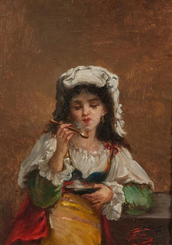 La toile "Soupe chaude" de Mariano Fortuny Marsal évoque une scène intime où la chaleur et la convivialité se mêlent. Les couleurs riches et vibrantes, allant des rouges profonds aux ocres dorés, créent une atmosphère chaleureuse et accueillante. La technique de Fortuny, mêlant réalisme et impressionnisme, donne vie aux textures des aliments et à la lumière douce qui baigne la scène. Chaque détail, du visage des personnages à la vapeur s'élevant du plat, invite à une contemplation apaisante, comme si l'on pouvait presque sentir l'odeur de la soupe réconfortante.