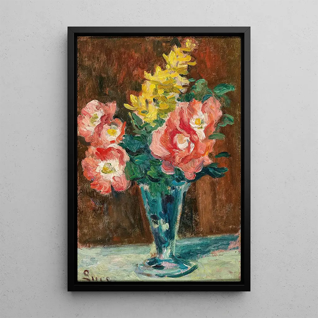 Det konsttryck "Vase med blommor" av Maximilien Luce är ett livfullt verk som fångar själva essensen av naturen. De strålande färgerna på blommorna, som sträcker sig från djupa röda till ljusa gula, blandas harmoniskt i en delikat vas. Luces impressionistiska teknik, kännetecknad av snabba penseldrag och färgklickar som placeras intill varandra, skapar en levande och dynamisk atmosfär. Detta konsttryck bjuder in betraktaren att fördjupa sig i en värld av blomsterprakt, där varje blomma tycks dansa under ljuset. Verket framkallar en känsla av friskhet och glädje, och förvandlar en enkel vas till ett verkligt mästerverk.