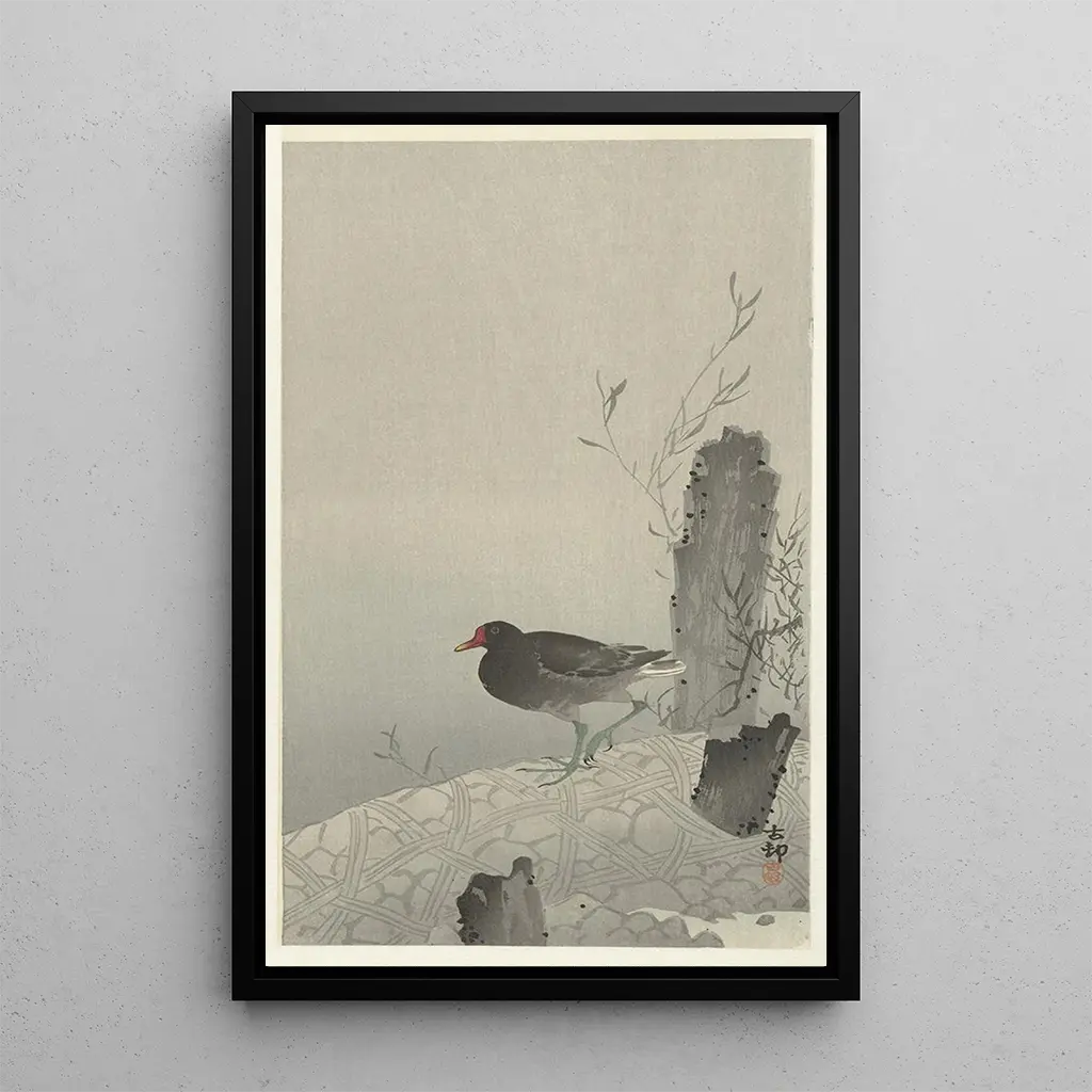 Konsttrycket av verket "Poule d'eau" för oss in i en naturlig värld där fauna och flora samexisterar i harmoni. Denna delikata avbildning av fågeln, ofta förknippad med vattenmiljöer, framhävs av nyanserade färger som subtilt fångar ljuset. Tekniken för tryck som används av Ohara Koson gör det möjligt att återge varje fjäder med enastående precision, samtidigt som den skapar en lugn och kontemplativ atmosfär. Verket framkallar ett ögonblick fångat i tiden, där betraktaren kan uppskatta den enkla och äkta skönheten i naturen.