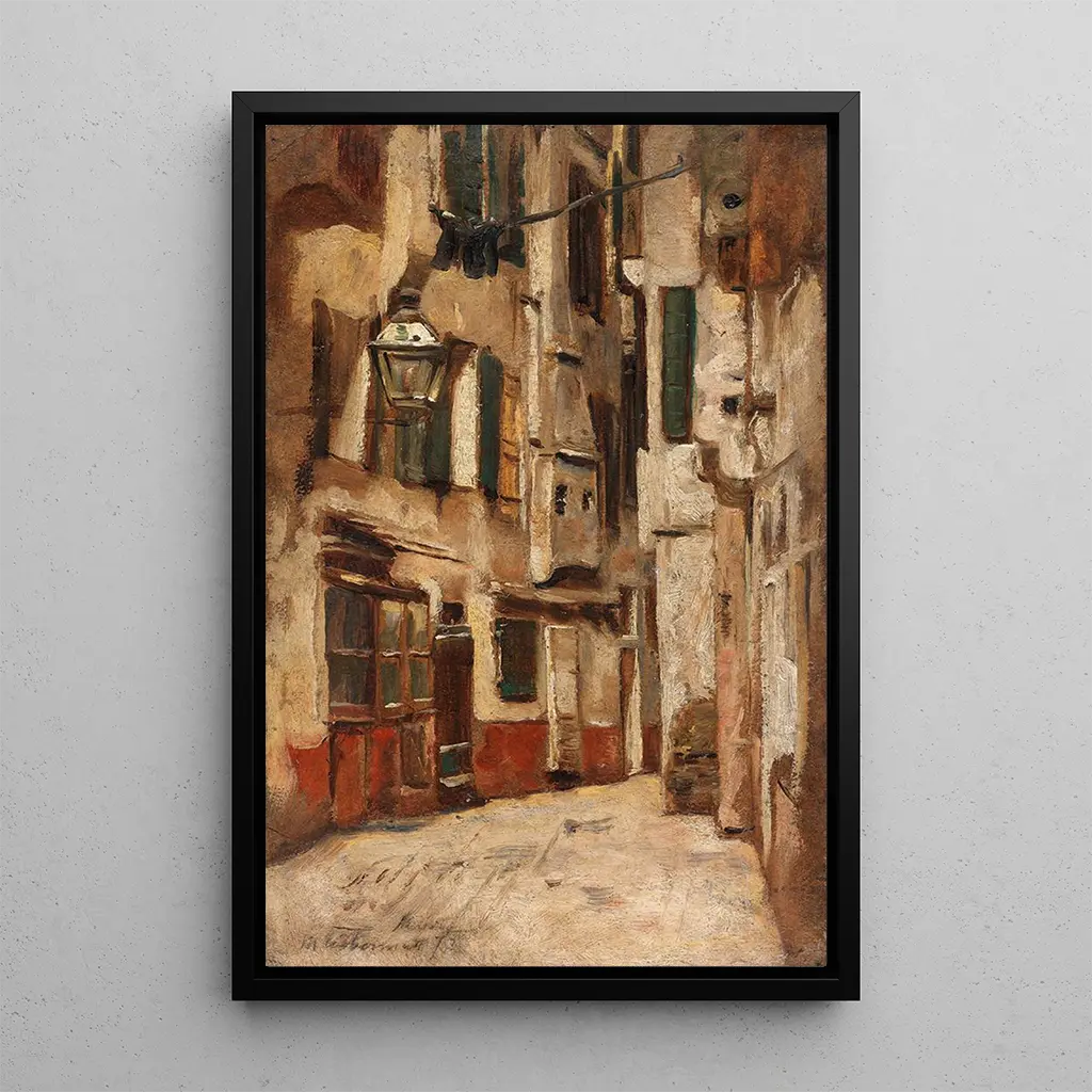 I detta konsttryck av det berömda verket "Ruelle vénitienne vers la droite" förflyttar Max Liebermann oss till Venetiens hjärta, där reflektionerna av byggnaderna på vattnet skapar en poetisk atmosfär. De varma färgerna och nyanserna av blått blandas harmoniskt och fångar det mjuka ljuset en venetiansk eftermiddag. Liebermanns impressionistiska teknik visar sig genom snabba och uttrycksfulla penseldrag, som ger liv åt denna lugna scen. De smala gränderna, kantade av gamla fasader, inbjuder till promenader och eftertanke, och väcker en känsla av nostalgi och lugn.